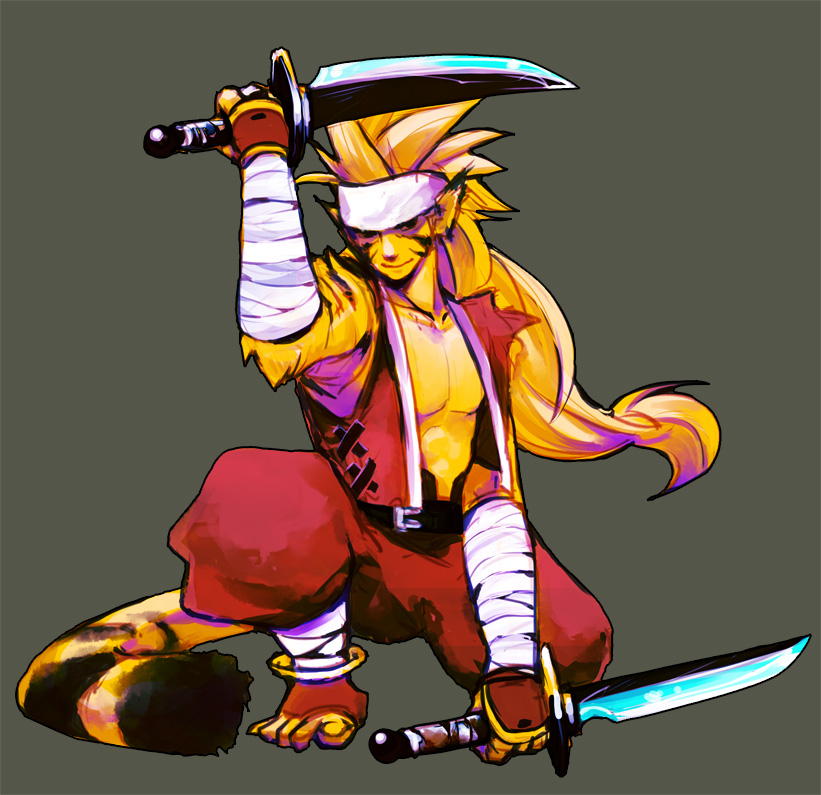 1boy bandaged_arm bandages bandana belt black_fur blonde_hair breath_of_fire breath_of_fire_iii cat_boy commentary_request dagger dual_wielding grey_background holding holding_dagger holding_knife holding_weapon kneeling knife kuwae long_hair male_focus no_shirt red_vest rei_(breath_of_fire) simple_background solo striped_tail tail tiger_boy toeless_legwear vest weapon white_bandana yellow_fur