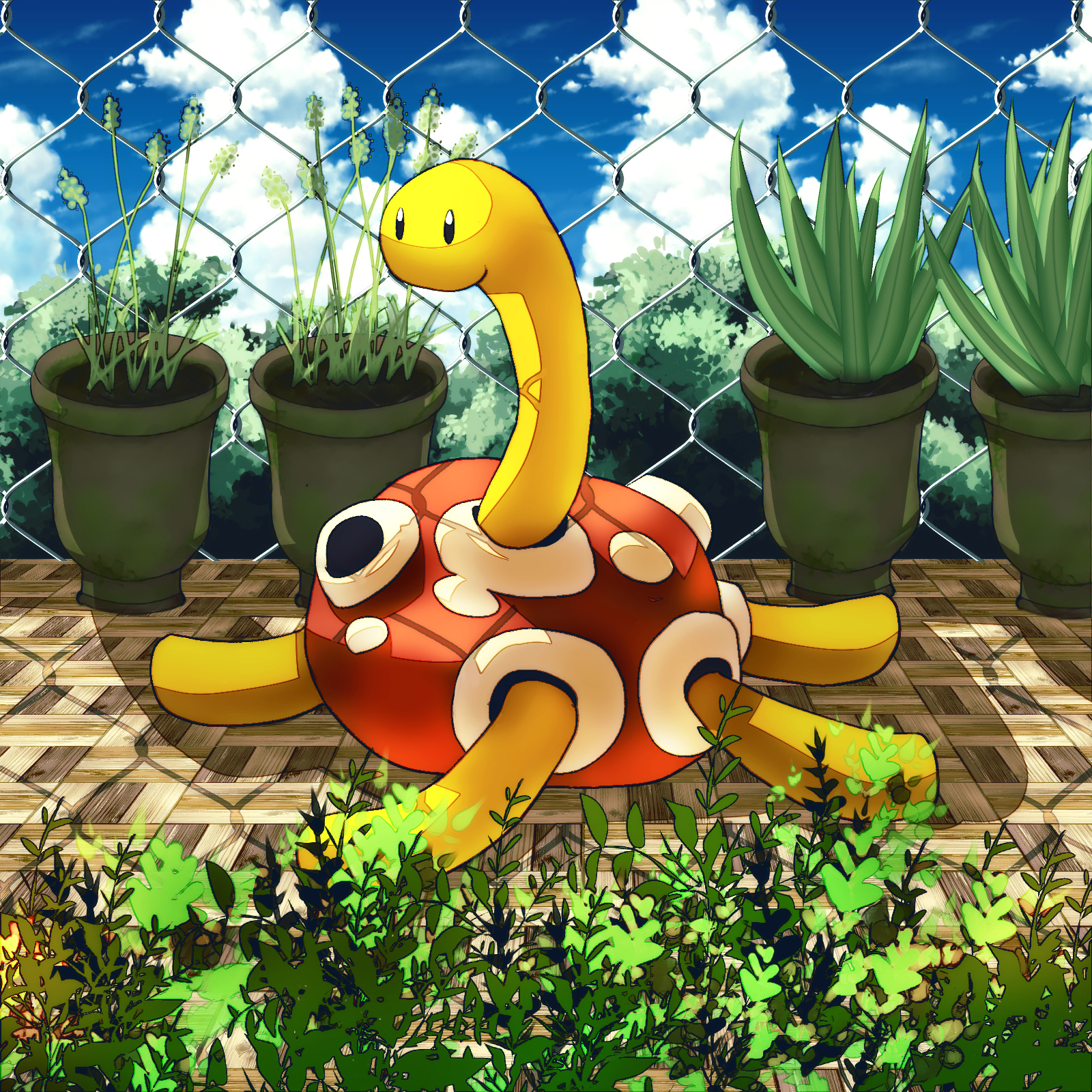 aloe_(plant) animal_focus blue_sky chain-link_fence cloud commentary_request day fence full_body gen_2_pokemon highres nintendo no_humans outdoors plant pokemon pokemon_(creature) potted_plant shuckle sky solo tapioca_usagi