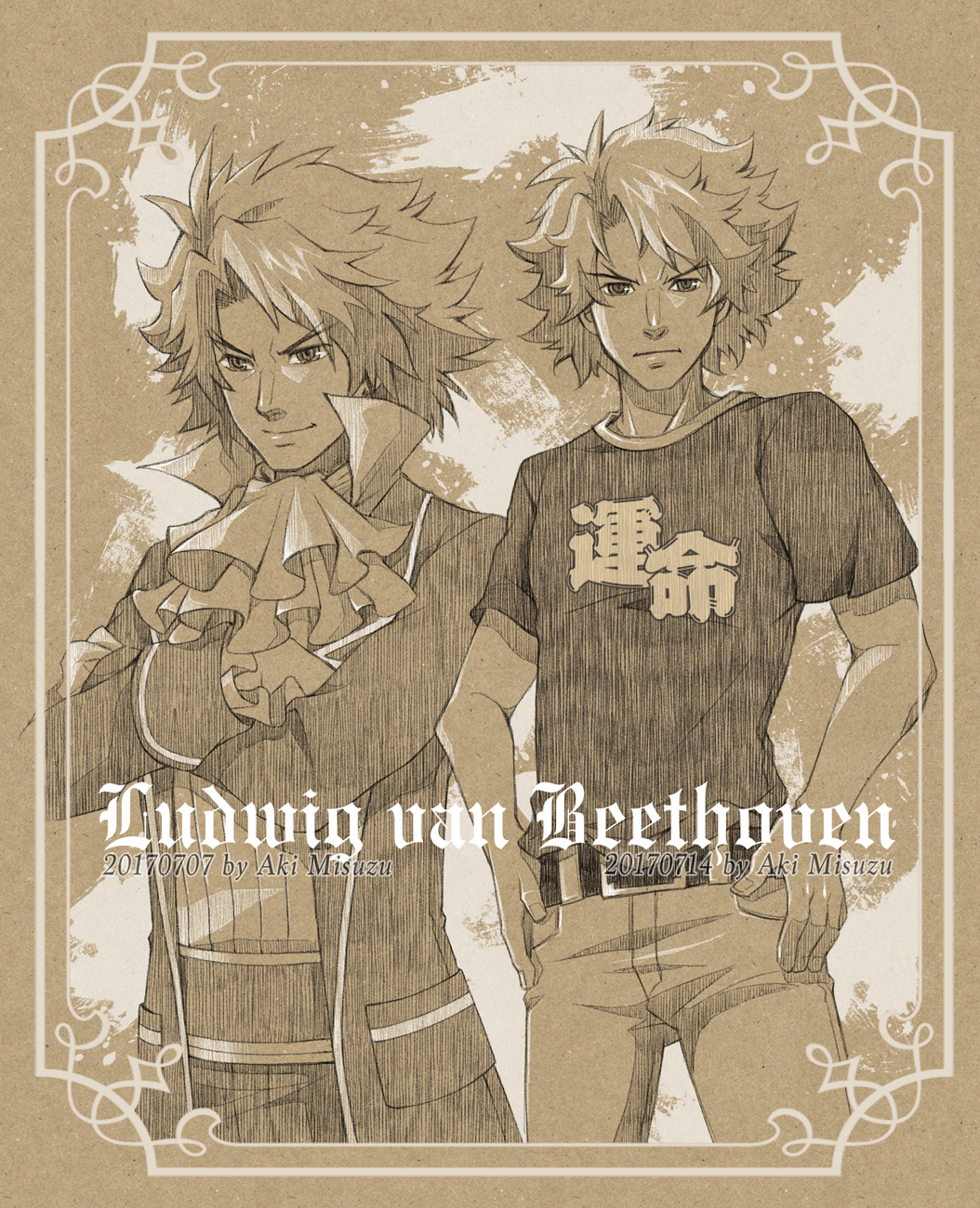 1boy ascot belt border character_name classicaloid clothes_writing coat crossed_arms hands_on_own_hips high_collar highres looking_at_viewer ludwig_van_beethoven_(classicaloid) male_focus misuzu_aki monochrome multiple_views pants ringed_eyes short_hair short_sleeves