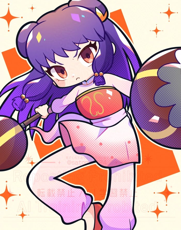 1girl artist_name bell bow chinese_clothes chui_(weapon) hair_bell hair_bow hair_ornament holding holding_weapon long_hair looking_at_viewer pants purple_hair ranma_1/2 red_eyes red_footwear satome_(min) shampoo_(ranma_1/2) sidelocks sparkle watermark weapon yellow_bow