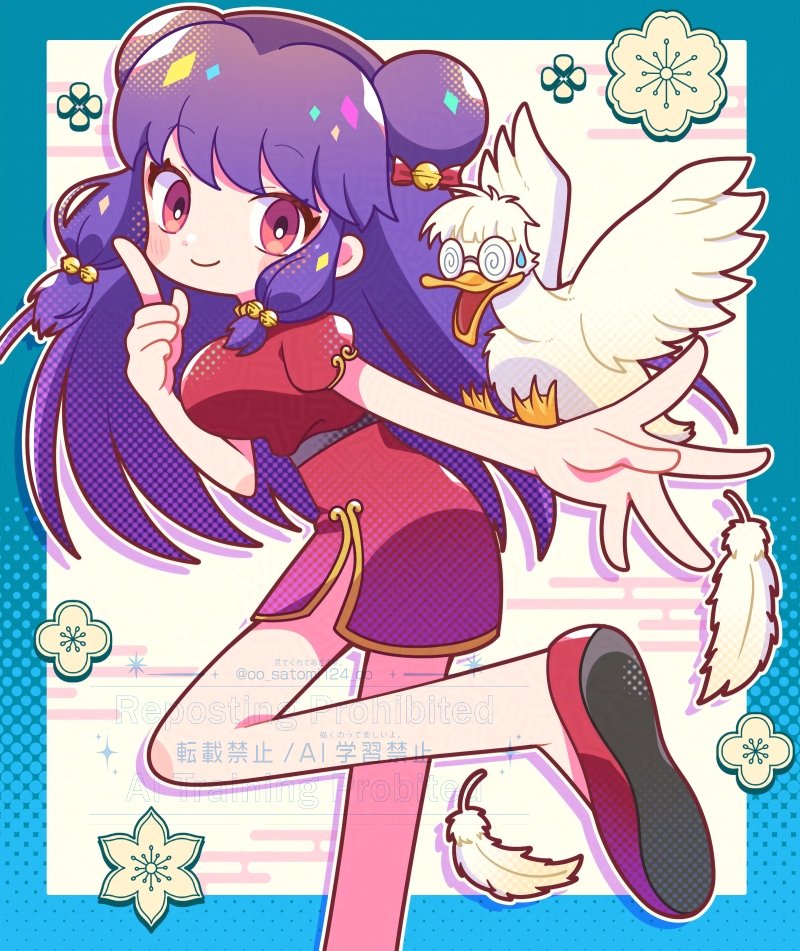 1girl artist_name bell bird chinese_clothes double_bun dress duck feathers glasses hair_bell hair_bun hair_ornament looking_at_viewer microdress mousse_(duck)_(ranma_1/2) purple_hair ranma_1/2 red_dress red_eyes red_footwear satome_(min) shampoo_(ranma_1/2) sidelocks smile sweatdrop watermark wings