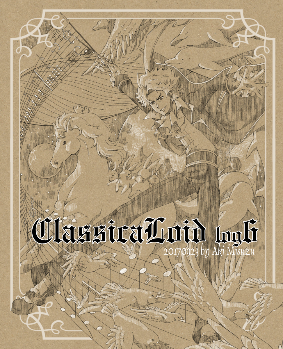 1boy animal artist_name ascot bird classicaloid conductor_baton copyright_name dated dolphin dove full_moon grin highres horse jacket long_legs ludwig_van_beethoven_(classicaloid) male_focus misuzu_aki monochrome moon pants rabbit shoes short_hair smile solo musical_staff whale