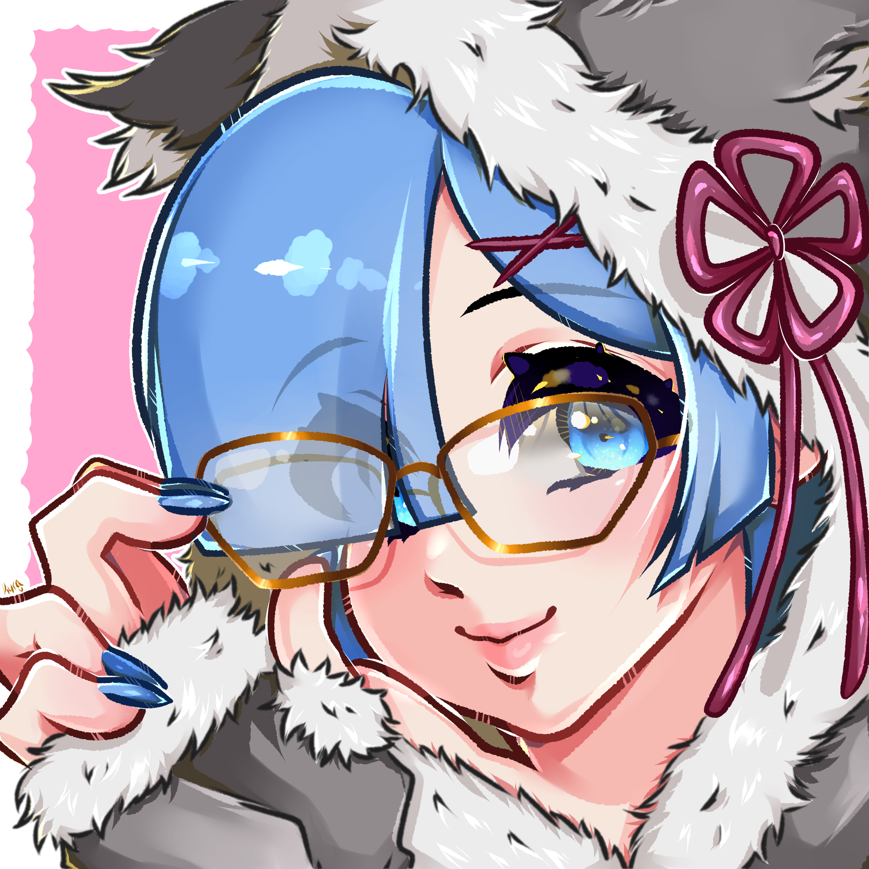 absurdres blue_eyes blue_hair glasses hair_ornament hair_over_one_eye highres hood kyranyan light_smile nail_polish puck_(re:zero) re:zero_kara_hajimeru_isekai_seikatsu rem_(re:zero) short_hair