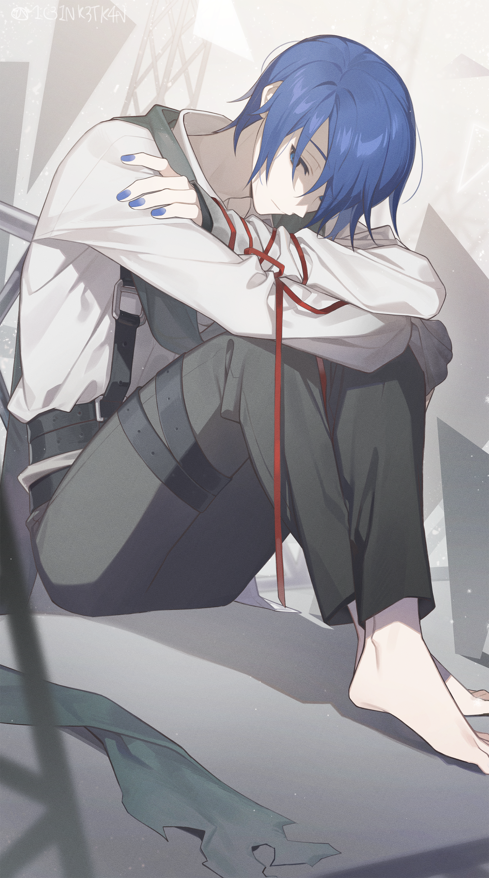 1boy 1c3ink3tk4n 25-ji_kaito absurdres arms_on_knees artist_name bad_id bad_twitter_id barefoot belt black_belt blue_eyes blue_hair blue_nails collared_shirt commentary_request crossed_ankles crossed_arms fence fingernails full_body grey_pants highres kaito_(vocaloid) male_focus nail_polish pale_skin pants parted_bangs pensive project_sekai red_ribbon ribbon scarf shirt short_hair sitting slouching solo suspenders vocaloid white_shirt