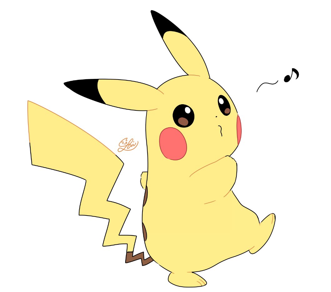 animal_ears colored_skin dot_nose gen_1_pokemon lai_(pixiv1814979) musical_note nintendo no_humans pikachu pokemon pokemon_(creature) signature solo tail whistling white_background white_eyes yellow_skin