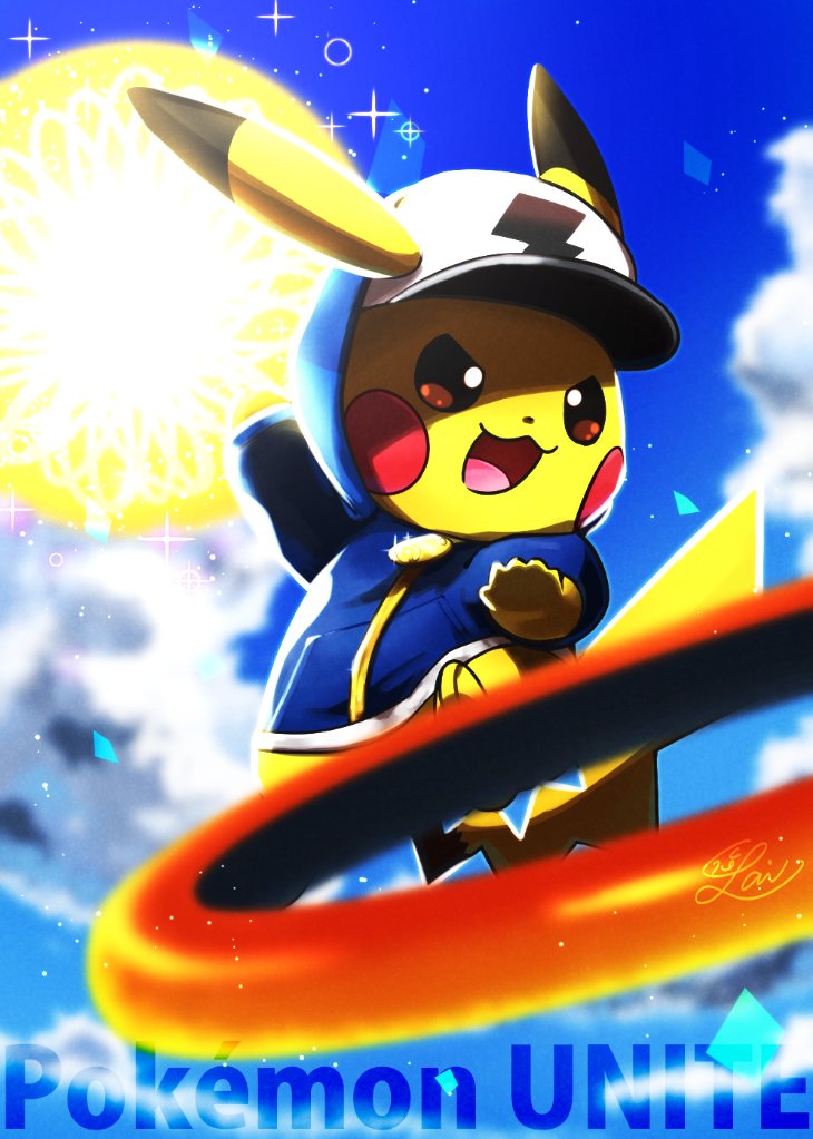 animal_ears baseball_cap blue_jacket blue_sky clothed_pokemon cloud colored_skin commentary_request copyright_name dated_commentary day dot_nose gen_1_pokemon hat hat_under_hood hood hood_up hooded_jacket jacket lai_(pixiv1814979) lightning_bolt_print lightning_bolt_symbol nintendo no_humans open_mouth outdoors pikachu pikachu_(hip-hop) pokemon pokemon_(creature) pokemon_unite print_hat signature sky smile solo tail white_hat yellow_skin