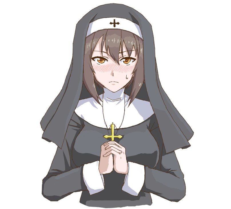 1girl acchan black_sleeves black_veil blush breasts brown_eyes brown_hair collar cross cross_necklace embarrassed girls_und_panzer habit headband holding holding_cross jewelry large_breasts looking_at_viewer necklace nishizumi_maho nun nun_headdress praying short_hair simple_background solo traditional_nun turtleneck veil white_collar white_headband