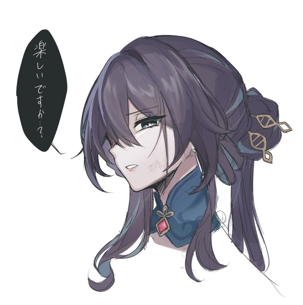 1girl aqua_collar brown_hair collar dna gem green_eyes hair_over_one_eye honkai:_star_rail honkai_(series) multicolored_hair red_gem ruan_mei_(honkai:_star_rail) satou_kouri simple_background solo speech_bubble streaked_hair translation_request upper_body white_background