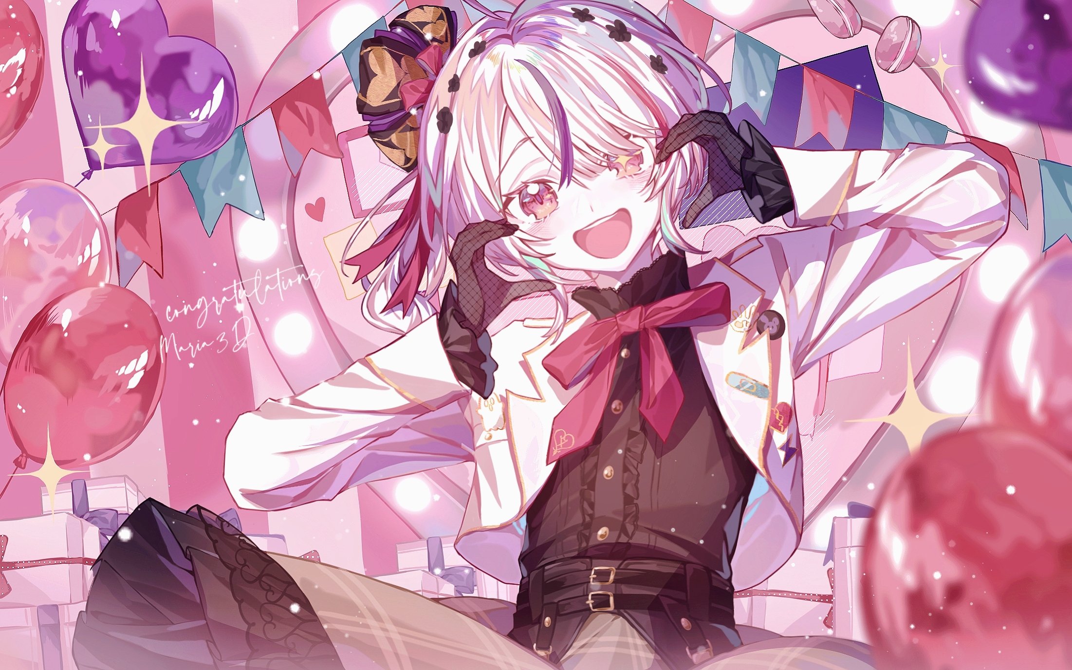 1girl :d balloon blurry blush box chapret10 character_name congratulations depth_of_field dot_nose fishnet_gloves fishnets flat_chest food gift gift_box gloves hair_between_eyes heart heart-shaped_mirror heart_hands highres macaron maria_marionette maria_marionette_(1st_costume) mirror multicolored_hair nijisanji nijisanji_en open_mouth pink_eyes pink_hair side_ponytail smile solo sparkle star_(symbol) star_in_eye streaked_hair symbol_in_eye table vanity_table virtual_youtuber