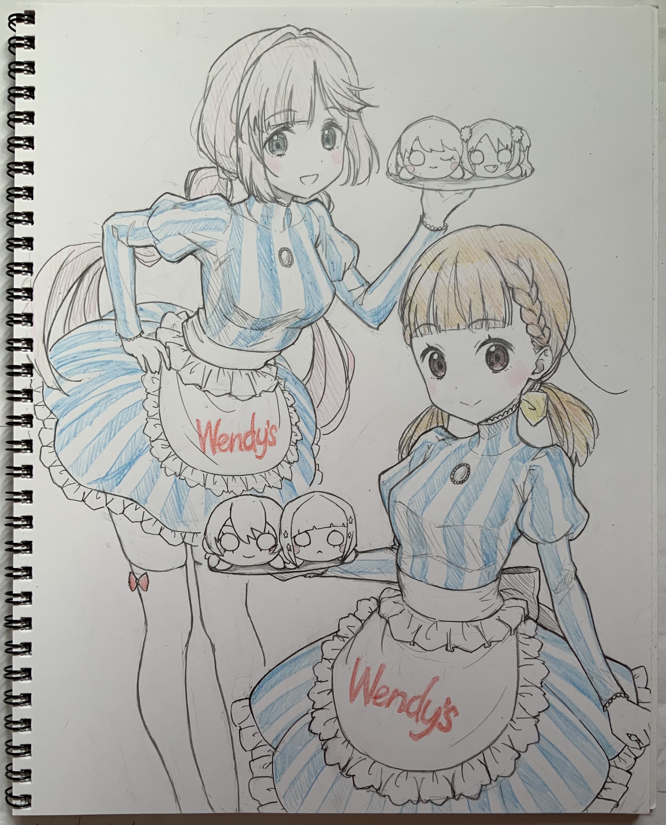 2girls :d ;) absurdres anyoji_hime apron blonde_hair blue_dress blue_eyes blunt_bangs blush blush_stickers bow bow_legwear braid breasts brown_hair center-flap_bangs character_doll closed_mouth commentary diagonal_bangs doll dollchestra dress frilled_apron frilled_dress frills frown fujishima_megumi gradient_hair graphite_(medium) hair_intakes hair_ornament highres holding holding_tray honochikacchi juliet_sleeves kachimachi_kosuzu leaning_forward link!_like!_love_live! long_hair long_sleeves looking_at_viewer love_live! low_twintails medium_breasts mira-cra_park! multicolored_hair multiple_girls murano_sayaka nesoberi official_alternate_costume official_alternate_hairstyle one_eye_closed open_mouth osawa_rurino partially_colored photo_(medium) pink_eyes pink_hair puffy_sleeves red_bow short_dress short_twintails side_ahoge side_braids sidelocks sketchbook smile split_mouth star_(symbol) star_hair_ornament striped_clothes striped_dress swept_bangs thighhighs traditional_media tray twintails vertical-striped_clothes vertical-striped_dress very_long_hair virtual_youtuber waist_apron wendy's white_apron white_dress white_thighhighs wide_oval_eyes yugiri_tsuzuri zettai_ryouiki