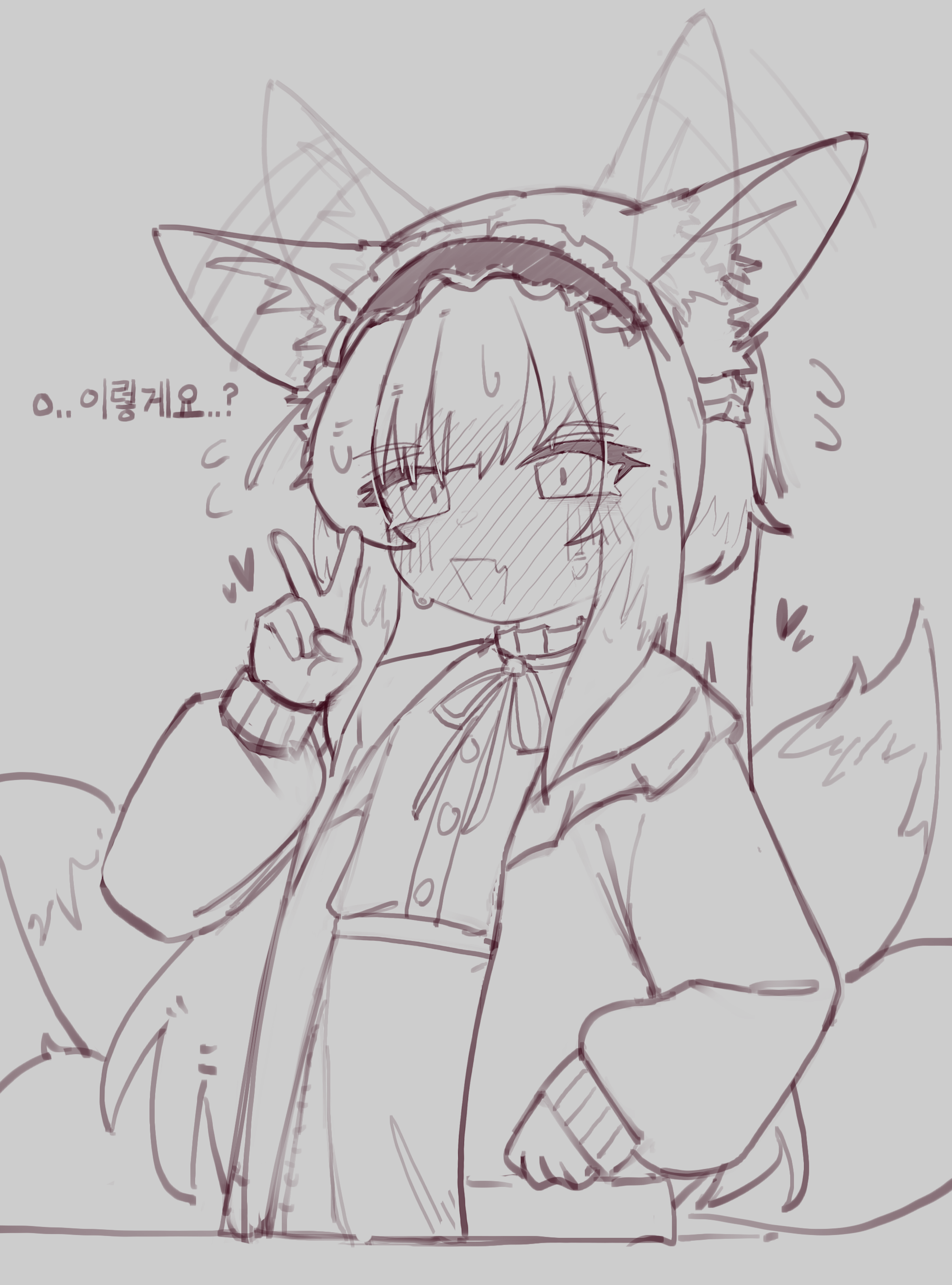 1girl absurdres animal_ear_fluff animal_ears arknights blush commentary cyan9322 ear_wiggle fang fox_ears fox_girl fox_tail frilled_hairband frills greyscale hairband highres kitsune korean_text kyuubi long_sleeves looking_at_viewer monochrome multiple_tails neck_ribbon nose_blush official_alternate_costume open_mouth puffy_long_sleeves puffy_sleeves ribbon sketch skin_fang solo suzuran_(arknights) suzuran_(spring_praise)_(arknights) tail translation_request v