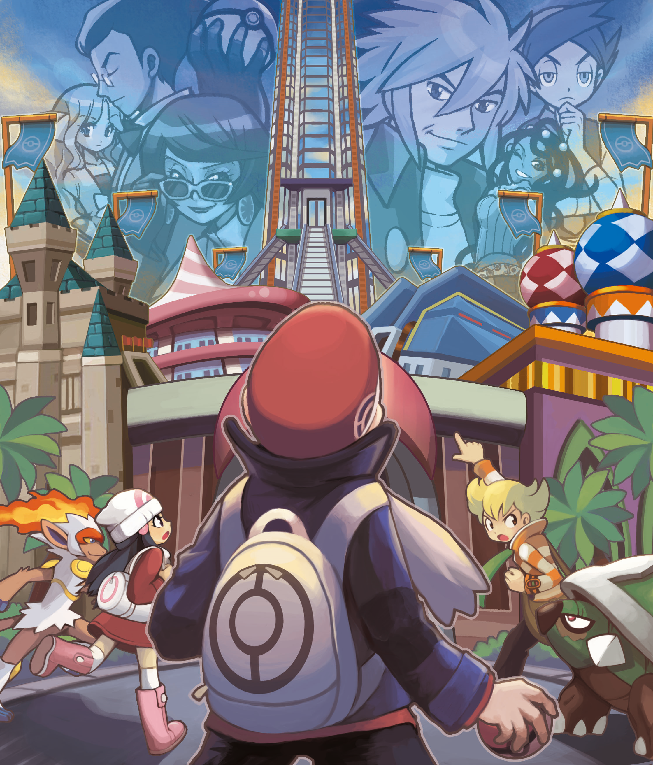 4girls 5boys :o absurdres argenta_(pokemon) artist_request backpack bag ball barry_(pokemon) battle_arcade_(pokemon) battle_castle_(pokemon) battle_factory_(pokemon) battle_frontier_(pokemon) battle_hall_(pokemon) battle_tower_(pokemon) beanie black_hair blonde_hair brown_eyes building caitlin_(pokemon) castle coat dahlia_(pokemon) darach_(pokemon) dawn_(pokemon) day flag gen_4_pokemon glasses grin hair_ornament hairclip hat highres holding holding_ball holding_poke_ball infernape long_hair looking_up lucas_(pokemon) multiple_boys multiple_girls nintendo official_art one_eye_closed outdoors palmer_(pokemon) pointing pointing_up poke_ball poke_ball_(basic) pokemon pokemon_(creature) pokemon_diamond/pearl/platinum pokemon_platinum red_hat smile spiked_hair standing swept_bangs third-party_source thorton_(pokemon) torterra walking white_hat winter_clothes