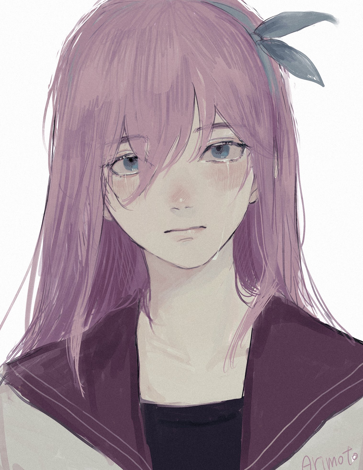 1girl arimoto_wada_dji aubrey_(faraway)_(omori) aubrey_(omori) black_sailor_collar black_shirt blue_eyes blue_hairband bow_hairband closed_mouth collarbone commentary_request crying crying_with_eyes_open hair_between_eyes hairband hashtag-only_commentary highres long_hair looking_at_viewer omori portrait sailor_collar shirt simple_background solo straight-on straight_hair tears white_background