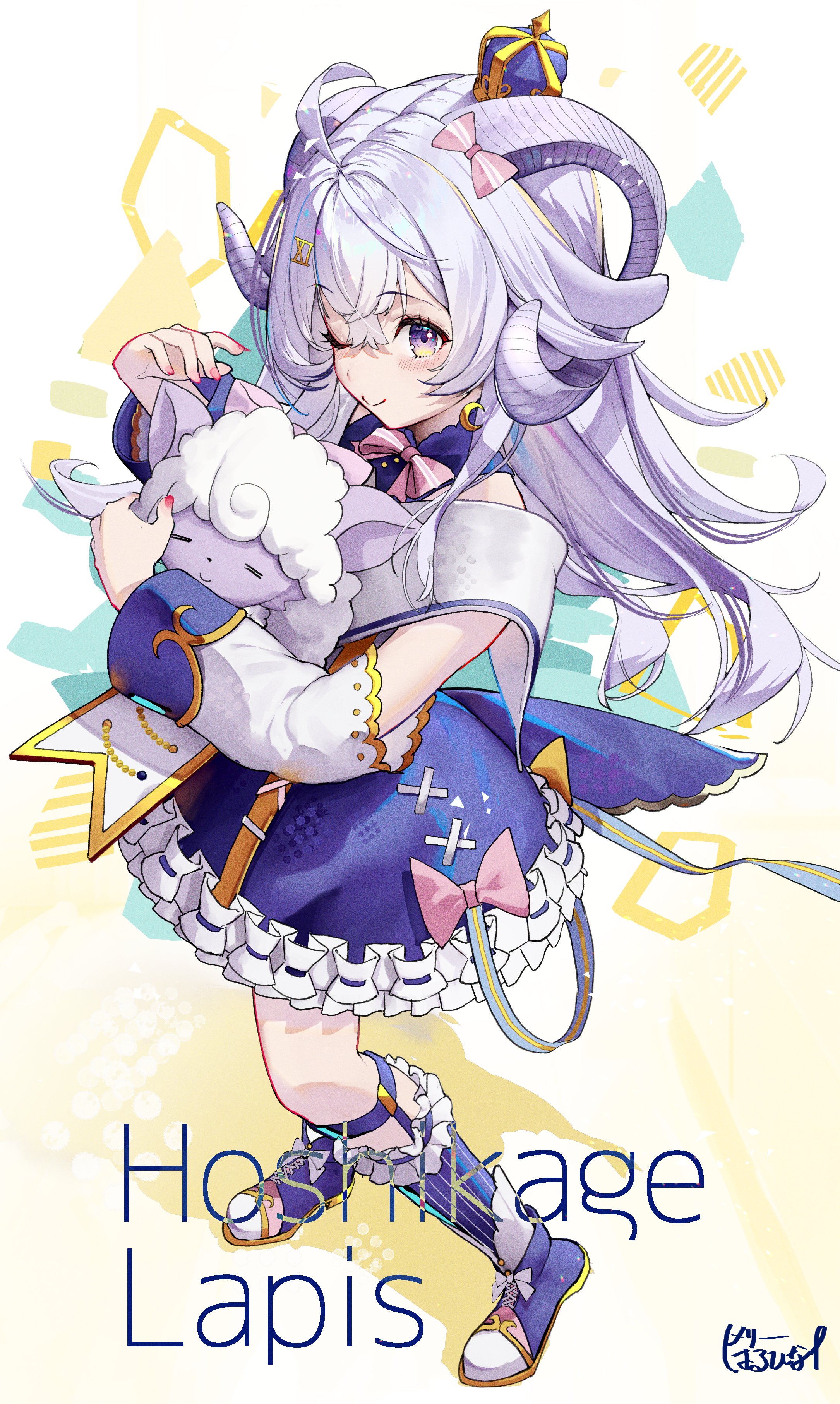1girl absurdres ahoge arched_crown artist_name blue_crown blue_dress blue_footwear blue_socks blush bow character_name closed_mouth crescent crown curled_horns detached_sleeves dress frilled_dress frills full_body haruhina_purple highres horns hoshikage_lapis indie_virtual_youtuber long_hair long_sleeves looking_at_viewer mini_crown number_hair_ornament one_eye_closed pink_bow purple_eyes purple_hair ribbon sleeveless sleeveless_dress socks solo standing virtual_youtuber