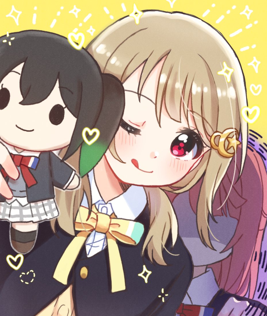 2girls ;) ;q asymmetrical_hair black_hair black_jacket blunt_bangs blush bob_cut brown_hair buttons cardigan character_doll closed_mouth collared_shirt commentary crescent crescent_hair_ornament doll dress_shirt faceless faceless_female gradient_hair green_hair grey_sweater hair_ornament hair_over_shoulder hairclip half_updo holding holding_doll impending_doom jacket long_hair long_sleeves looking_at_viewer love_live! love_live!_nijigasaki_high_school_idol_club love_live!_nijigasaki_high_school_idol_club_the_movie_-_finale medium_hair miniskirt multicolored_hair multiple_girls nakasu_kasumi neck_ribbon nijigasaki_school_uniform one_eye_closed partially_unbuttoned pink_hair plaid_clothes plaid_skirt pleated_skirt red_eyes red_ribbon ribbon school_uniform shaded_face shirt skirt smile solo_focus sweater swept_bangs takasaki_yu tongue tongue_out twintails two-tone_hair uehara_ayumu upper_body white_shirt white_skirt winter_uniform yellow_background yellow_cardigan yellow_ribbon yoon_(yoon_lovelive)