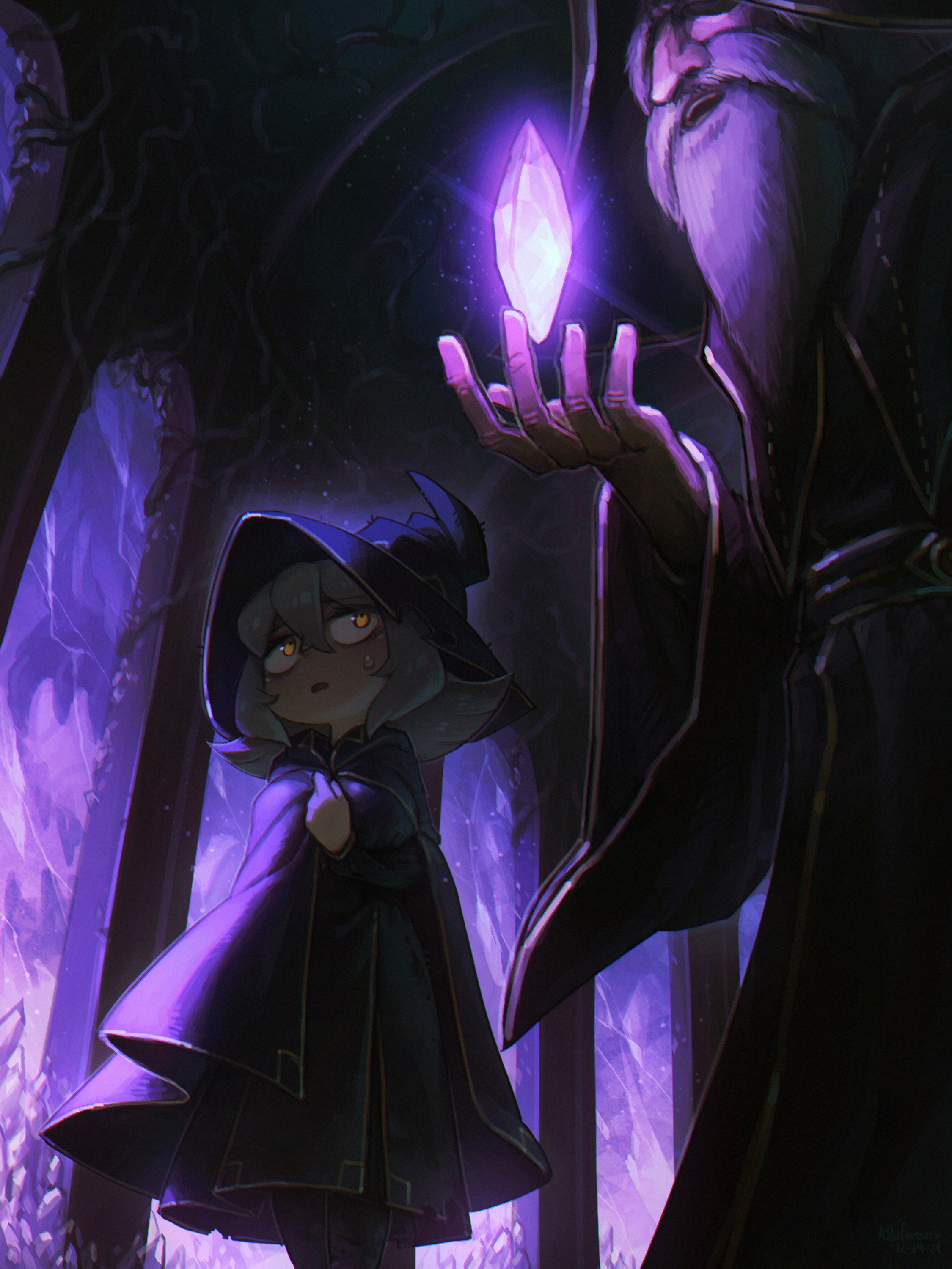 1boy 1girl absurdres beard cloak crystal facial_hair fantasy flail_witch_(porforever) grey_hair hat highres indoors long_beard looking_at_another magic old old_man original porforever robe sweatdrop wizard wizard_hat yellow_eyes