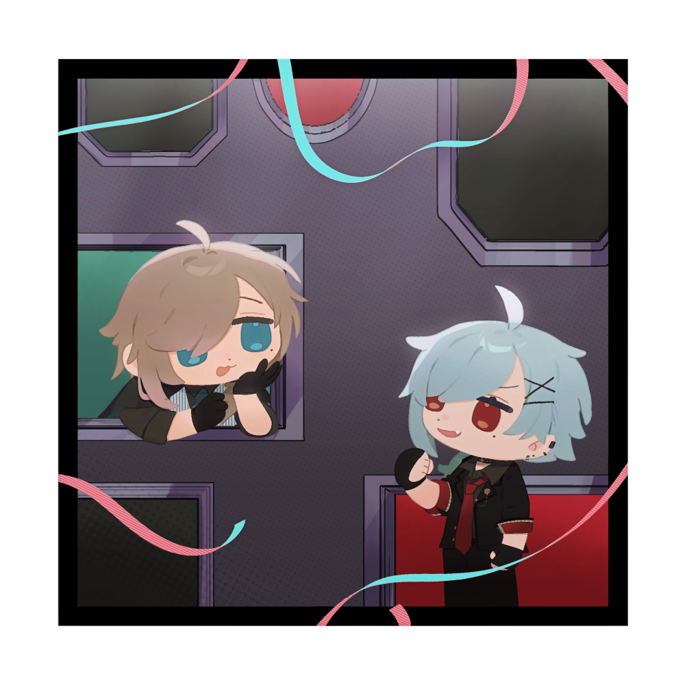2boys :d ahoge black_border black_gloves black_jacket black_pants black_shirt blue_eyes border brown_hair chibi collared_shirt ear_piercing earrings fingerless_gloves gloves grey_hair grey_shirt hair_ornament hair_over_one_eye hairclip hand_up jacket jacket_on_shoulders jewelry kanae_(nijisanji) kiduta_cielo kuzuha_(nijisanji) male_focus mole mole_under_eye multiple_boys necktie nijisanji open_mouth pants piercing pointy_ears red_eyes red_necktie shirt smile standing striped_clothes striped_vest vertical-striped_clothes vertical-striped_vest vest virtual_youtuber x_hair_ornament