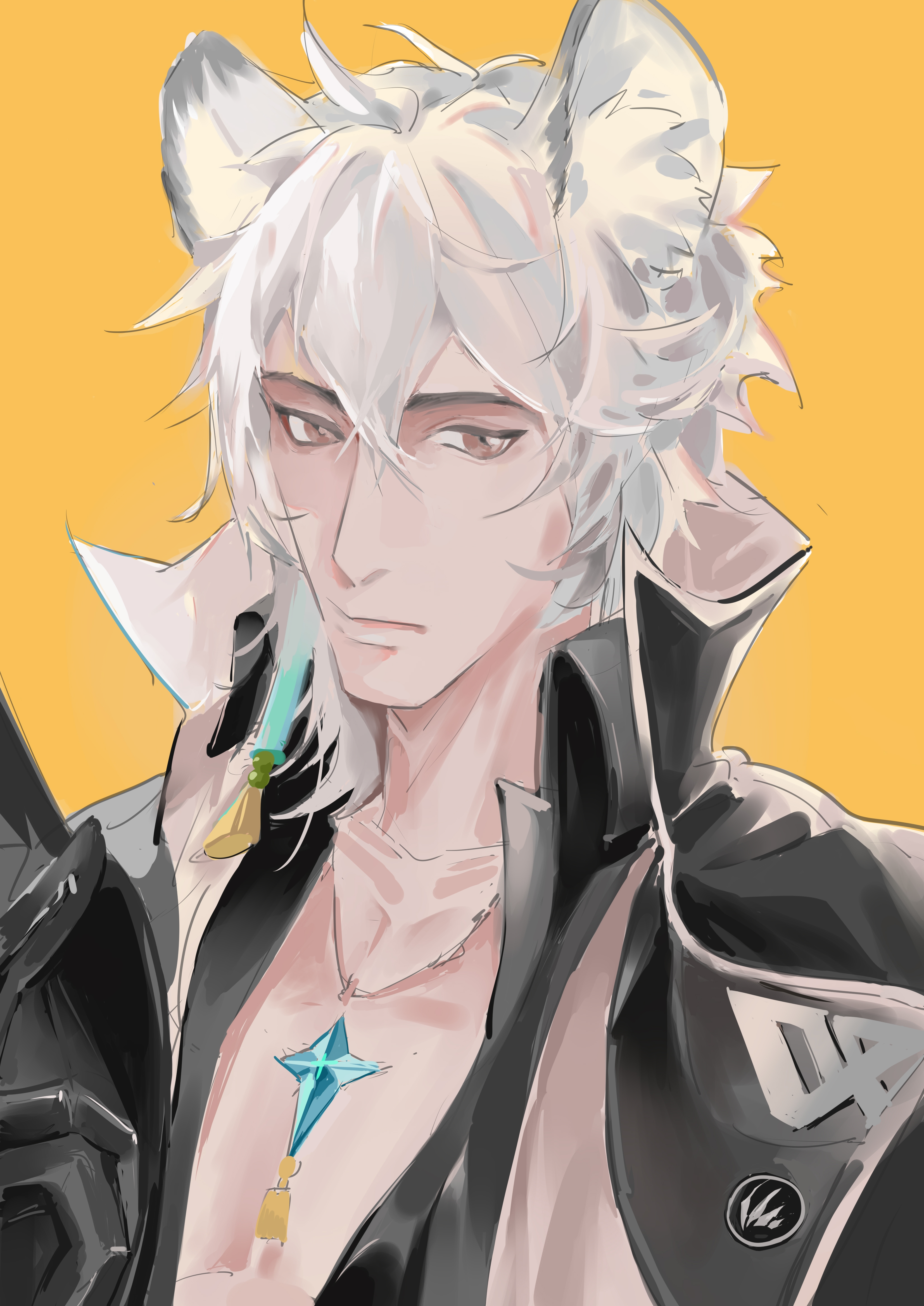 1boy absurdres animal_ears arknights black_jacket brown_eyes commentary_request ear_piercing earrings frown hair_between_eyes hat highres holding holding_unworn_clothes holding_unworn_hat jacket jewelry male_focus necklace open_clothes open_jacket piercing pirate_hat silverash_(arknights) silverash_(seeker)_(arknights) single_earring snow_leopard_boy snow_leopard_ears solo star_(symbol) thick_eyebrows unworn_hat unworn_headwear white_hair yellow_background zuoxiaoxiao062