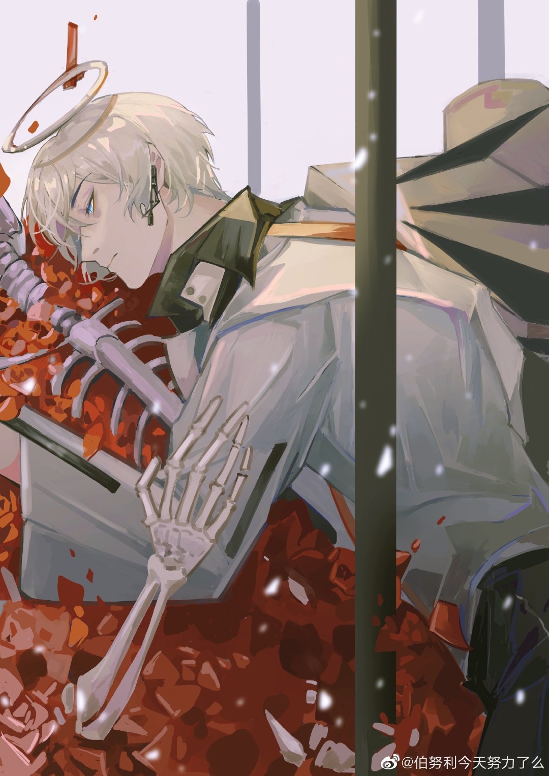 1boy angel angel_wings arknights black_collar black_pants blue_eyes bone collar ear_piercing earrings executor_(arknights) flower frown hair_between_eyes halo highres jacket jewelry lying male_focus on_stomach pants piercing red_flower ribs rock skeleton solo white_background white_hair white_jacket wings zuoxiaoxiao062