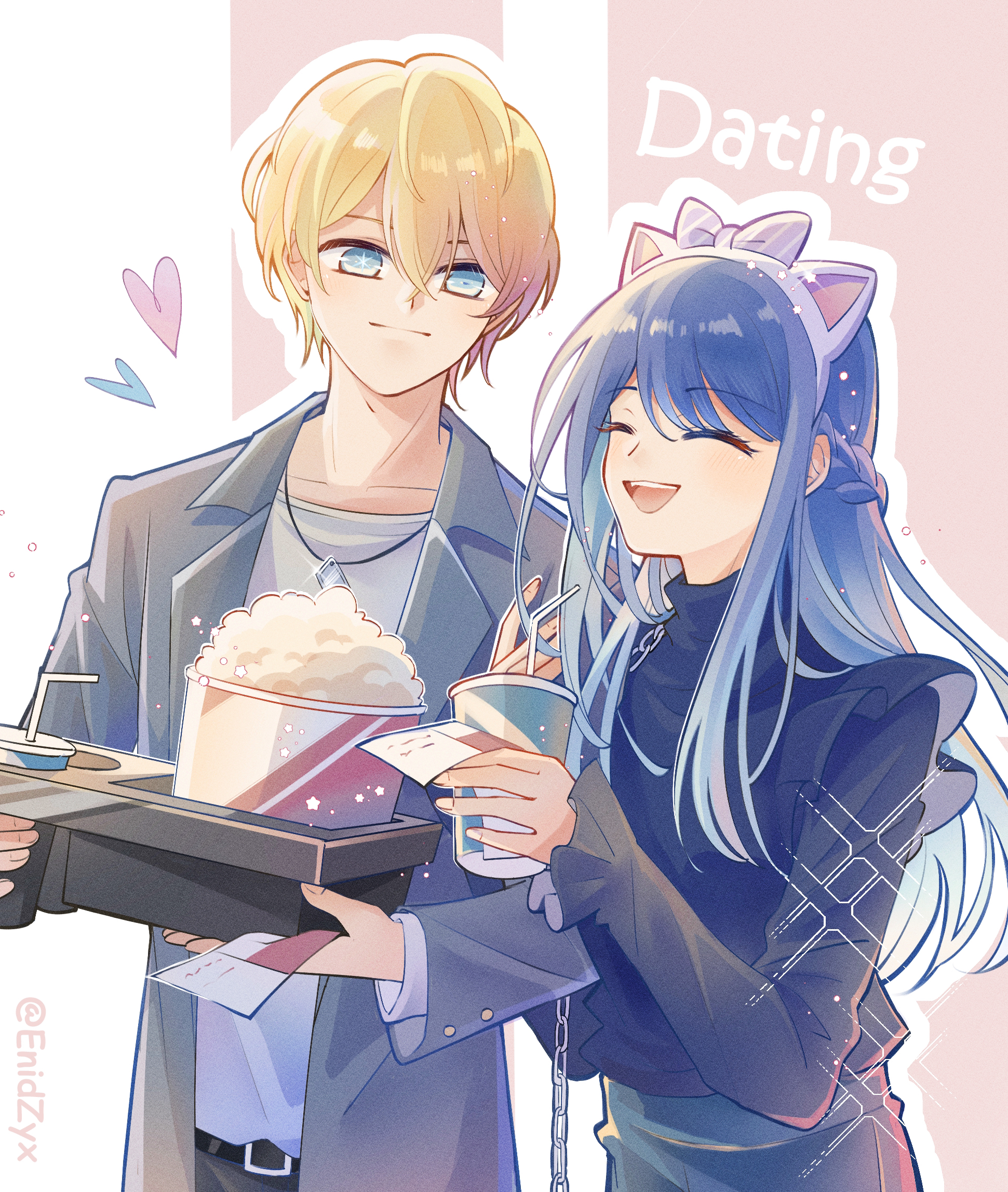 1boy 1girl :d ^_^ animal_ear_hairband animal_ears artist_name belt black_belt black_jacket blonde_hair blue_eyes blue_hair bow bow_hairband casual cat_ear_hairband cat_ears closed_eyes closed_mouth collarbone commentary_request couple cup dating diagonal-striped_bow disposable_cup drink drinking_straw english_text enidzyx fake_animal_ears food frills hairband happy heart hetero highres holding holding_cup holding_drink holding_ticket hoshino_aquamarine jacket kurokawa_akane lapels light_smile locked_arms long_hair long_sleeves looking_at_another notched_lapels open_clothes open_jacket open_mouth oshi_no_ko outline popcorn shirt side-by-side sidelocks simple_background smile star-shaped_pupils star_(symbol) striped_bow symbol-shaped_pupils teeth ticket turtleneck twitter_username two-handed upper_body upper_teeth_only white_outline white_shirt