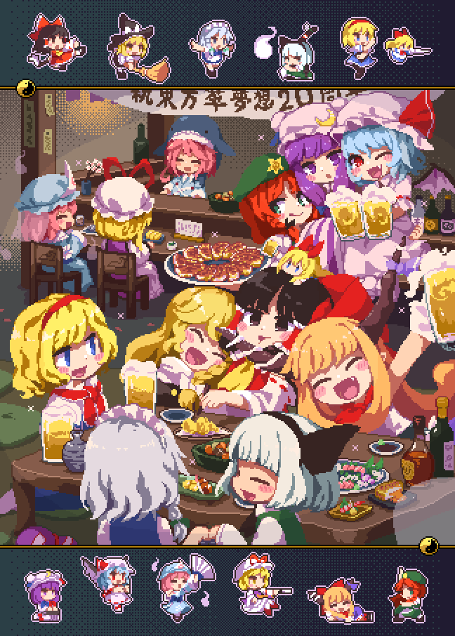 6+girls :d :q alcohol alice_margatroid animal_hat ascot bat_wings beer blonde_hair blue_eyes blue_hair blush bottle bow broom brown_eyes brown_hair closed_eyes food green_eyes grey_hair hair_bow hakurei_reimu hat hat_ribbon head_on_another's_shoulder hong_meiling ibuki_suika izayoi_sakuya kirisame_marisa konpaku_youmu konpaku_youmu_(ghost) kumamoto_(bbtonhk2) long_hair mob_cap multiple_girls okunoda_miyoi open_mouth orange_hair patchouli_knowledge pink_hair pixel_art purple_eyes purple_hair red_eyes red_hair remilia_scarlet ribbon saigyouji_yuyuko sake_bottle shanghai_doll short_hair smile sushi tongue tongue_out touhou whale_hat wings yakumo_yukari