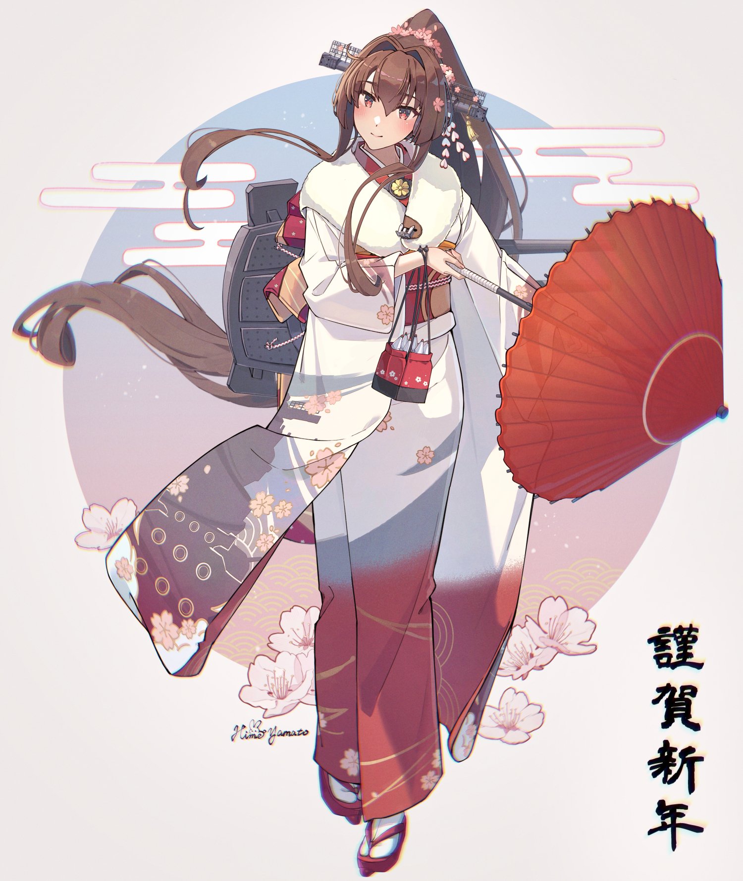 1girl bag blush brown_hair commentary floral_print flower full_body hair_flower hair_ornament headgear highres himeyamato holding holding_umbrella japanese_clothes kantai_collection kimono long_hair long_sleeves obi oil-paper_umbrella pink_flower ponytail sash sidelocks signature smile solo standing tabi tassel umbrella very_long_hair wide_sleeves yamato_(kancolle) yamato_(new_year)_(kancolle)