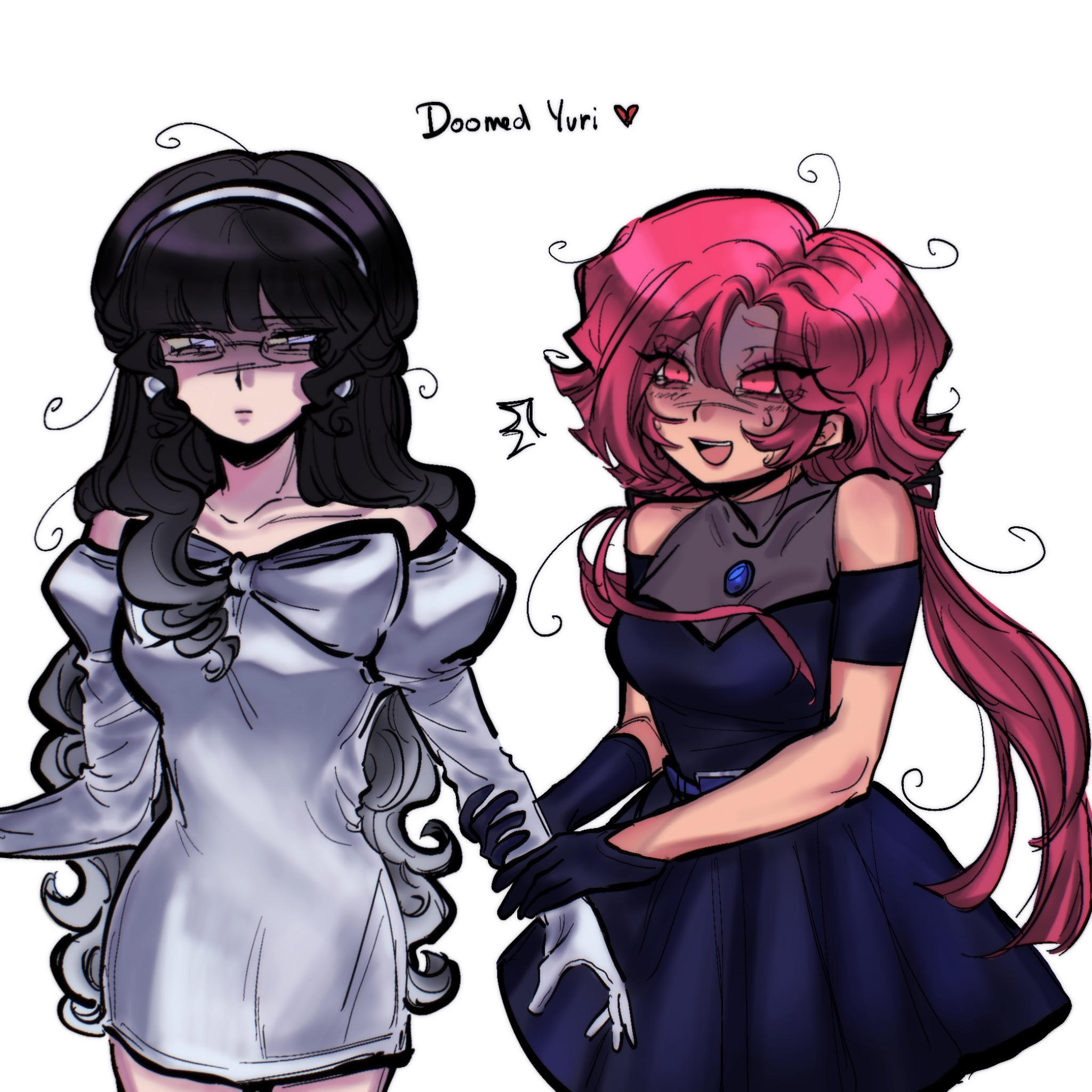 2girls alien_stage alt_text asymmetrical_gloves black_dress black_hair bow chest_bow closed_mouth clothing_cutout commentary cosplay curly_hair diana_venecia dress dress_bow earrings elbow_gloves english_commentary eva_tsunaka glasses gloves hairband highres holding_another's_arm jewelry jinnipilled long_hair looking_at_another loose_hair_strand mizi_(alien_stage) mizi_(alien_stage)_(cosplay) multiple_girls off-shoulder_dress off_shoulder open_mouth pencil_dress pink_eyes pink_hair project:_eden's_garden shoulder_cutout simple_background single_elbow_glove smile sua_(alien_stage) sua_(alien_stage)_(cosplay) uneven_gloves very_long_hair white_background white_bow white_dress white_gloves white_hairband