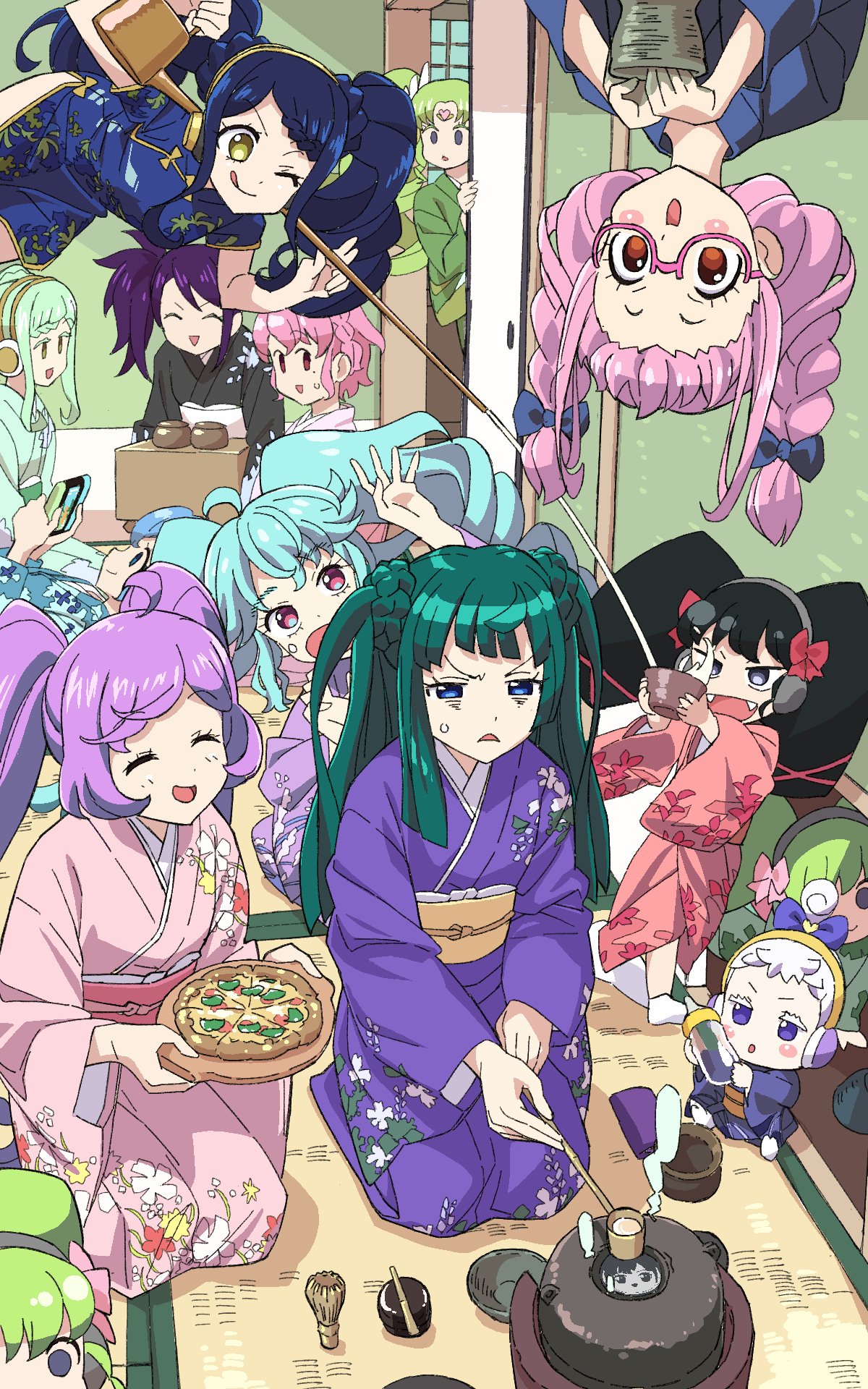 1boy 6+girls :d black_hair blue_eyes blue_hair bottle braid brother_and_sister closed_eyes commentary_request crossdressing dorothy_west falala_a_larm falulu falulu_(awakened) floral_print food gaaruru_(pripara) garara_s_leep green_hair highres holding holding_food idol_time_pripara indoors janis_(pripara) japanese_clothes katasumi_amari kiki_ajimi kimono long_hair long_sleeves manaka_laala masunikuru milk_bottle mini_falulu multiple_girls obi open_mouth pink_hair pink_kimono pizza pouring pretty_series print_kimono pripara purple_hair purple_kimono reona_west sash short_hair siblings sitting smile toudou_shion trap tsukikawa_chili twin_braids twins twintails upside-down wide_sleeves