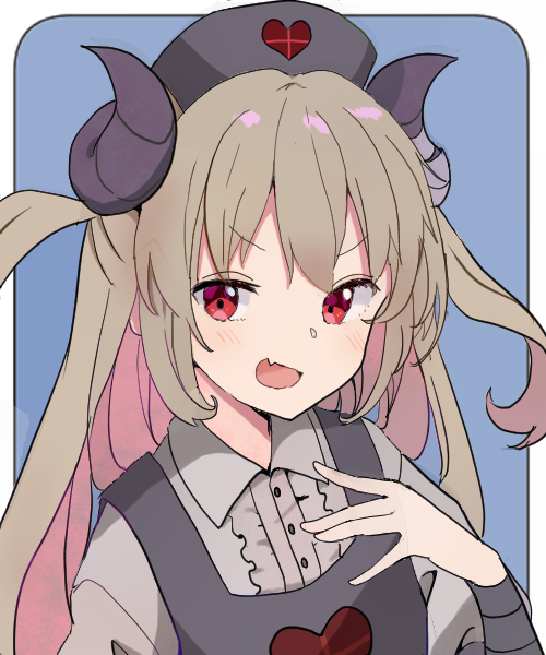 1girl apron bandaged_arm bandaged_horn bandages black_apron black_hat black_horns brown_hair fang grey_shirt hat heart heart_print horns light_blush long_hair looking_at_viewer natori_sana natori_sana_(devil_natori) nurse_cap open_mouth red_eyes sana_channel shirt solo upper_body virtual_youtuber youasato