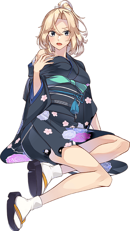 1girl 2025 black_kimono blonde_hair floral_print flower full_body holding hornet_(kancolle) hornet_(new_year)_(kancolle) hornet_(new_year_mode)_(kancolle) japanese_clothes kantai_collection kimono konishi_(koconatu) legs long_hair long_sleeves looking_at_viewer new_year official_alternate_costume official_art open_mouth ponytail sandals sitting solo torn_clothes transparent_background wide_sleeves zouri