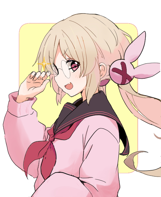1girl brown_hair fang from_side glasses hair_ornament looking_at_viewer looking_to_the_side low_twintails natori_sana natori_sana_(school_uniform) neckerchief open_mouth orange_eyes rabbit_hair_ornament red_neckerchief sana_channel school_uniform serafuku solo twintails virtual_youtuber youasato