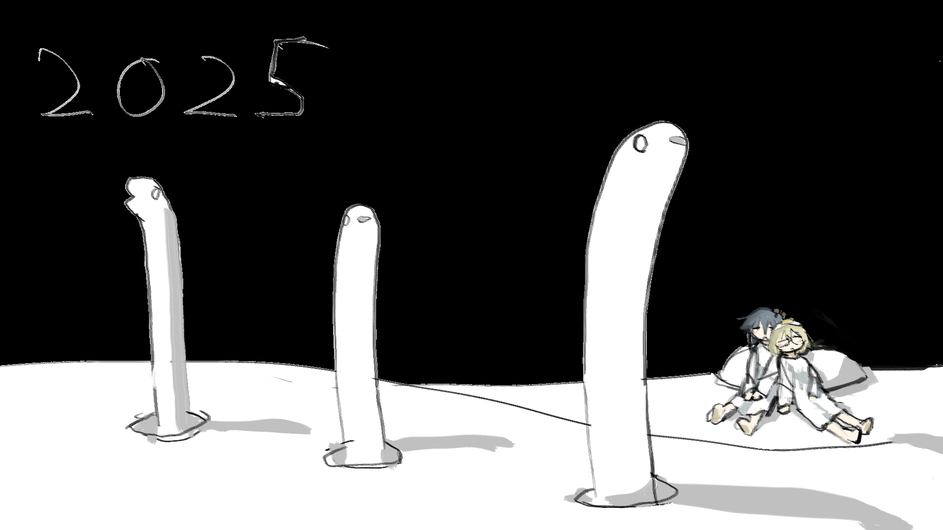 2025 2girls black_hair blonde_hair creature dress food food_on_head fried_egg happy_new_year highres landscape multiple_girls mushroom new_year object_on_head rock shimeji_simulation sleeping tsukishima_shijima tsukumizu white_dress yamashita_majime