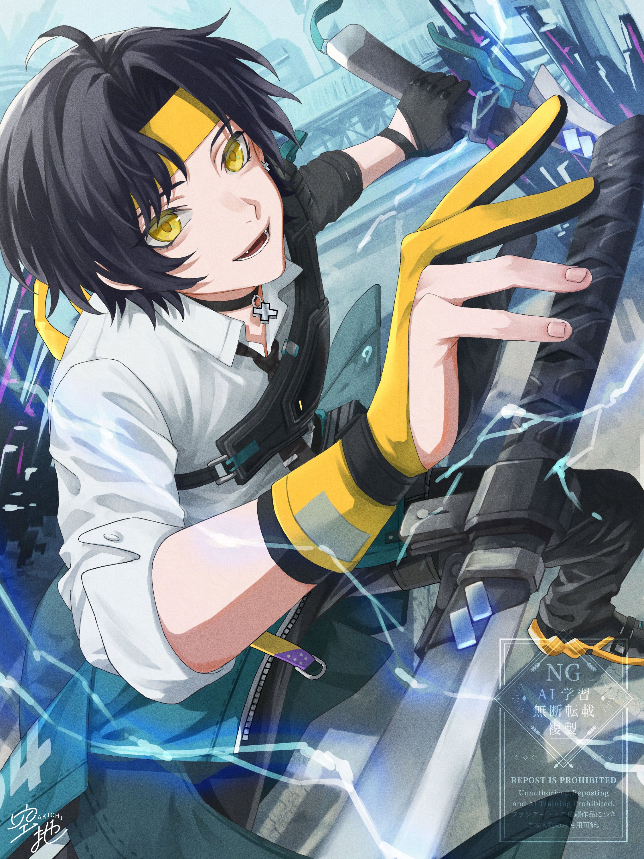 1boy absurdres asaba_harumasa black_choker black_gloves black_hair black_pants choker fangs fingerless_gloves gloves headband highres holding holding_weapon male_focus multicolored_gloves open_mouth pants shirt short_hair sword weapon white_shirt xxx_akc yellow_headband zenless_zone_zero