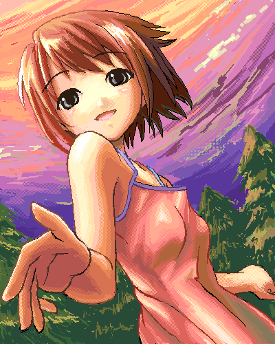1girl :d archived_source bare_arms bare_shoulders dress gradient_sky grey_eyes iska jaggy_lines lowres open_mouth original outdoors pine_tree pink_dress red_hair short_hair sky smile solo tree twilight