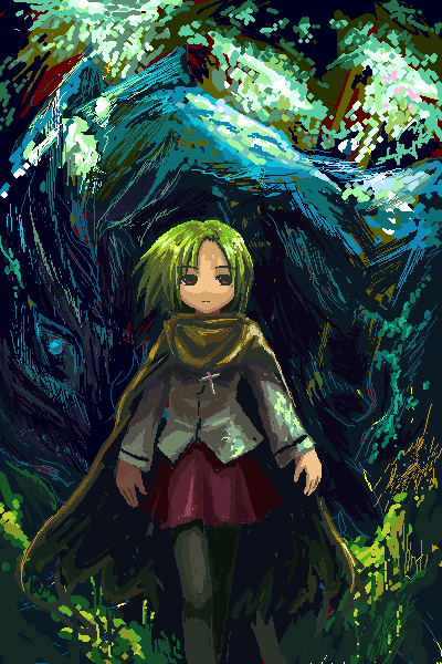 1girl archived_source black_pantyhose cloak cross green_hair iska jaggy_lines long_sleeves miniskirt original pantyhose red_eyes red_skirt shirt short_hair skirt solo white_shirt yellow_cloak