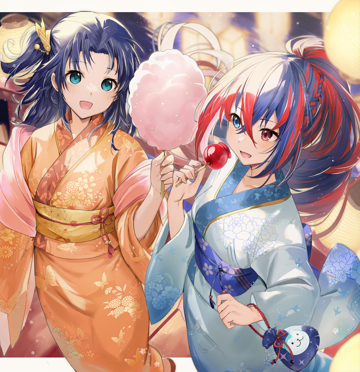 2girls female_alear_(fire_emblem) alternate_costume alternate_hairstyle blue_eyes blue_hair blue_kimono blue_sash braid candy_apple commentary cotton_candy crossed_bangs crown_braid female_kris_(fire_emblem) fire_emblem fire_emblem:_new_mystery_of_the_emblem fire_emblem_engage food hair_ornament haru_(nakajou-28) heterochromia highres holding holding_candy_apple holding_cotton_candy holding_food japanese_clothes kimono lantern multicolored_hair multiple_girls nintendo official_alternate_hairstyle open_mouth orange_kimono orange_sash pink_sarong ponytail red_hair sarong sash sommie_(fire_emblem) split-color_hair two-tone_hair