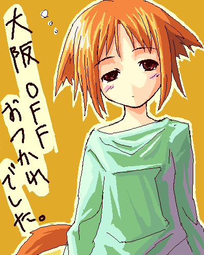 1girl animal_ears archived_source closed_mouth iska jaggy_lines long_sleeves lowres orange_hair orange_tail original outline red_eyes short_hair sleepy solo squeans tail uneven_eyes yellow_background