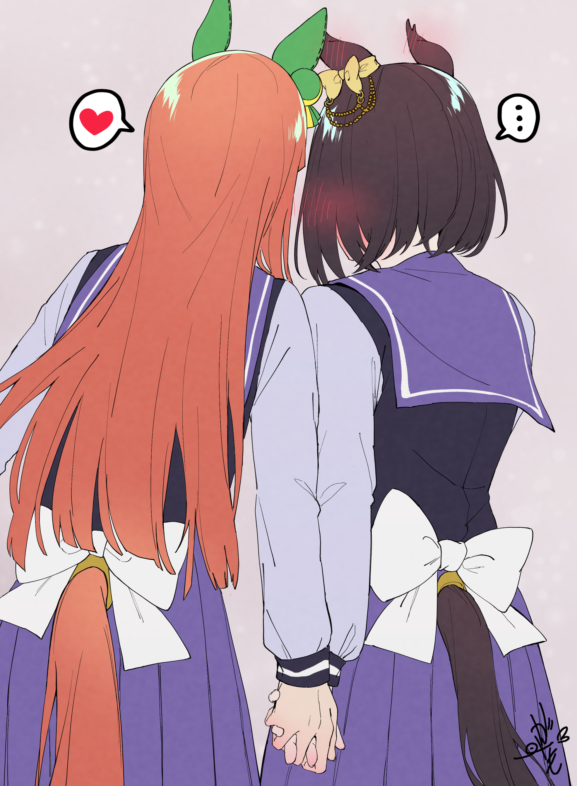 ... 2girls absurdres air_groove_(umamusume) animal_ears back_bow blush_visible_through_hair bow brown_hair commentary_request facing_away from_behind heart highres holding_hands horse_ears horse_girl horse_tail interlocked_fingers long_hair long_sleeves multiple_girls orange_hair purple_background purple_sailor_collar purple_serafuku purple_shirt purple_skirt sailor_collar school_uniform serafuku shirt signature silence_suzuka_(umamusume) skirt spoken_ellipsis spoken_heart sugamo_(rainysnowy108) tail tracen_school_uniform umamusume white_bow yuri
