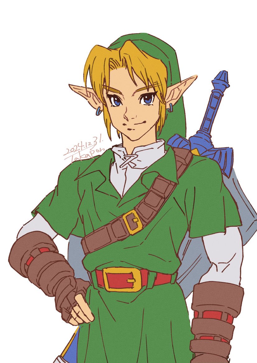 1boy 2024 belt belt_buckle blonde_hair blue_eyes buckle dated earrings facing_viewer fingerless_gloves gauntlets gloves hand_on_own_hip hat jewelry link looking_at_viewer male_focus nintendo pointy_ears shield shield_on_back smile solo sword sword_on_back takapon-o-ji the_legend_of_zelda the_legend_of_zelda:_ocarina_of_time tunic upper_body weapon weapon_on_back