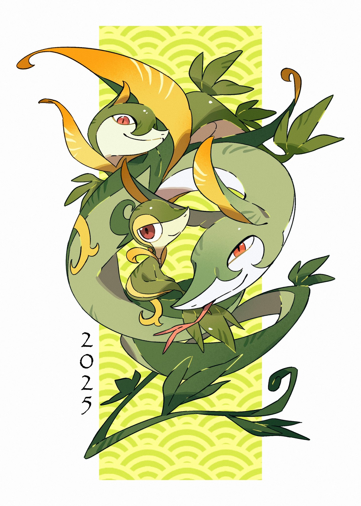 2025 chinese_zodiac closed_mouth commentary forked_tongue gen_5_pokemon highres leaf looking_at_viewer new_year nintendo no_humans pokemon pokemon_(creature) red_eyes serperior servine simple_background snivy untranslatable_commentary tongue wulie_errr year_of_the_snake