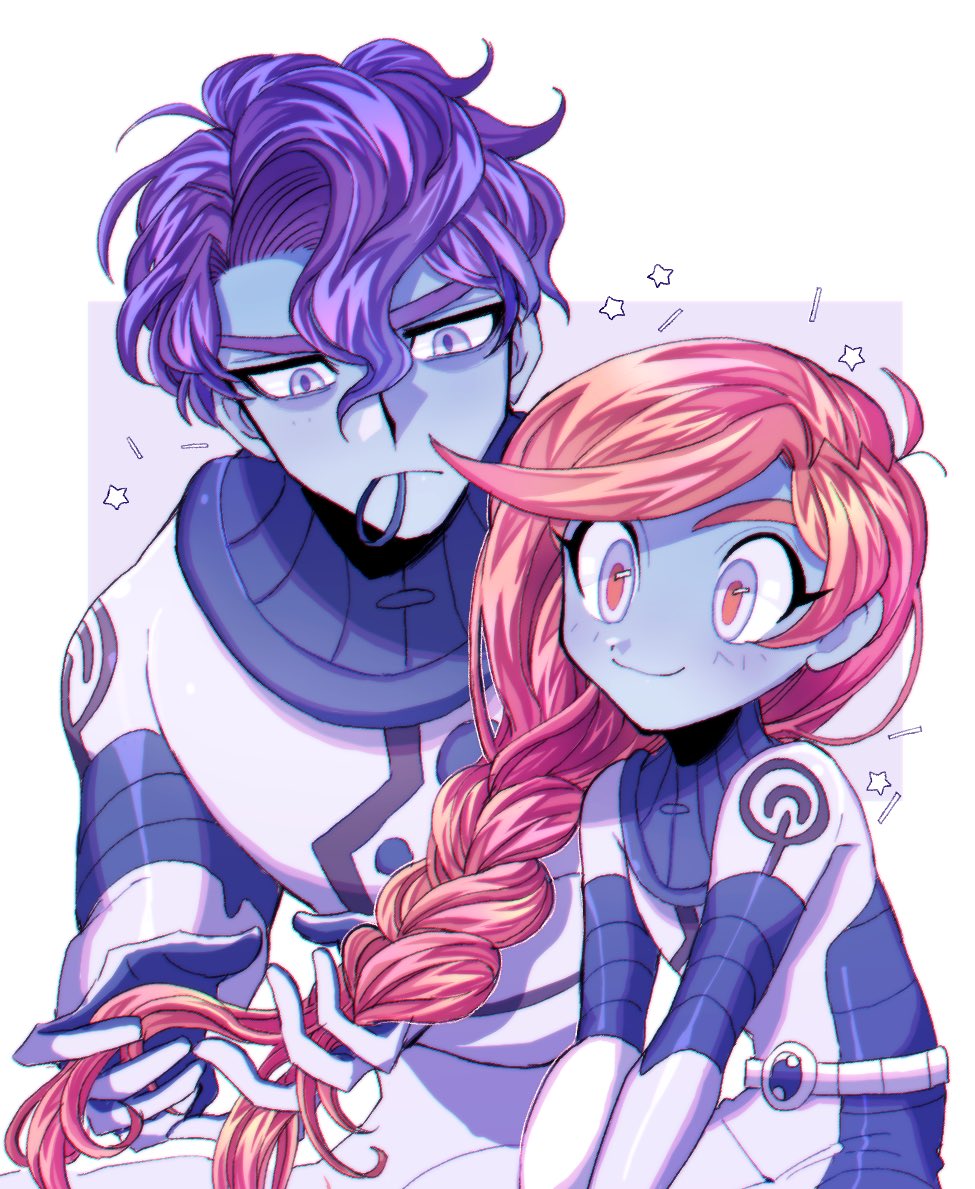 1boy 1girl belt blue_eyes blush braiding_hair closed_mouth commentary_request dulse_(pokemon) eyelashes gloves hair_tie hair_tie_in_mouth hairdressing hand_in_another's_hair long_hair maguyu_(9x9_81) mouth_hold nintendo orange_hair orange_pupils pokemon pokemon_ultra_sun_and_ultra_moon purple_eyes purple_hair short_hair simple_background smile star_(symbol) ultra_recon_squad_uniform white_background white_belt zossie_(pokemon)