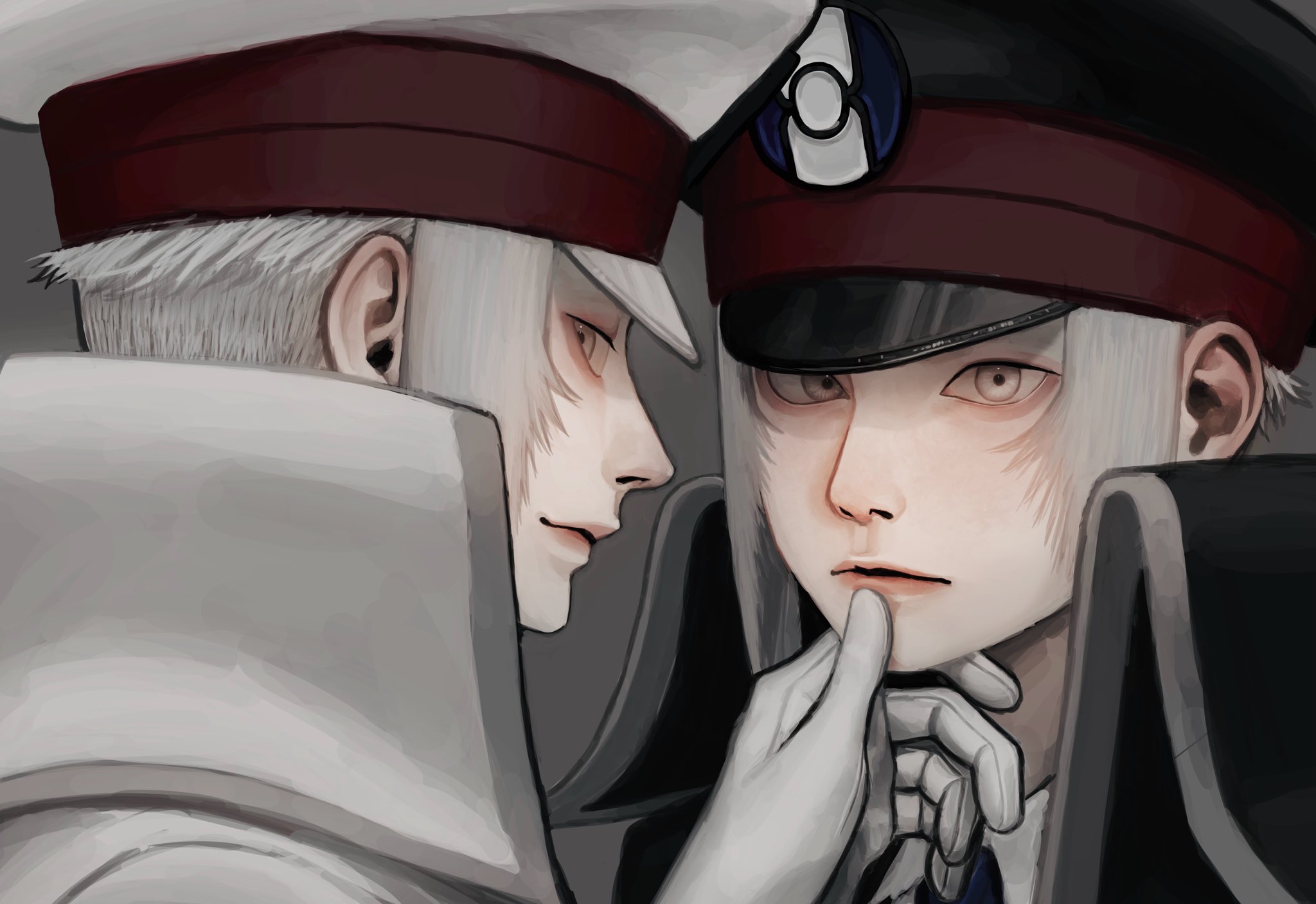 2boys arm_up black_coat black_hat brothers closed_mouth coat collared_coat commentary_request emmet_(pokemon) gloves grey_background grey_eyes grey_trim hand_on_another's_chin hat high_collar highres ingo_(pokemon) light_smile looking_at_viewer looking_to_the_side male_focus multiple_boys nintendo peaked_cap pokemon pokemon_black_and_white realistic short_hair siblings sideburns sideways_glance simple_background twins very_short_hair white_coat white_gloves white_hair white_hat yagurahinoki