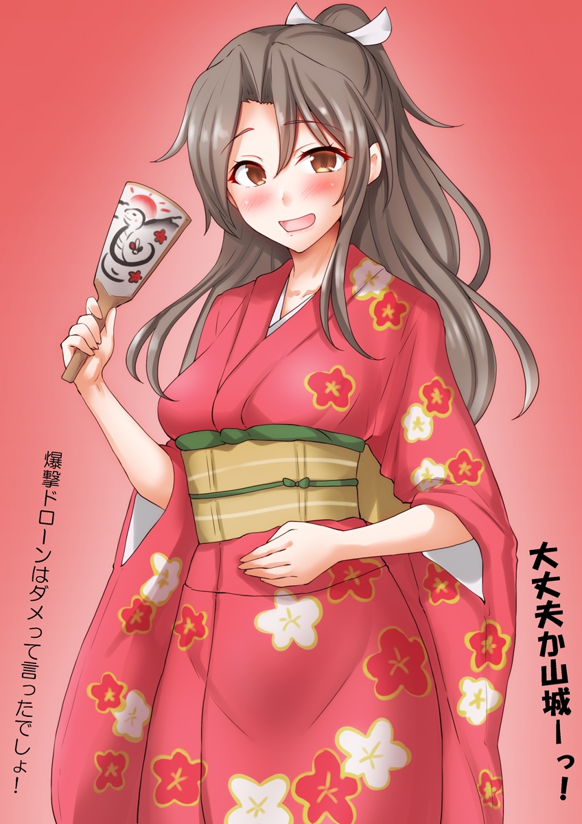 1girl alternate_costume anti_(untea9) breasts brown_eyes brown_hair chinese_zodiac floral_print hachimaki headband high_ponytail highres japanese_clothes kantai_collection kimono long_hair long_sleeves looking_at_viewer obi ponytail racket red_kimono sash small_breasts smile solo striped_headband uihou_(new_year)_(kancolle) year_of_the_snake zuihou_(kancolle) zuihou_(new_year)_(kancolle)
