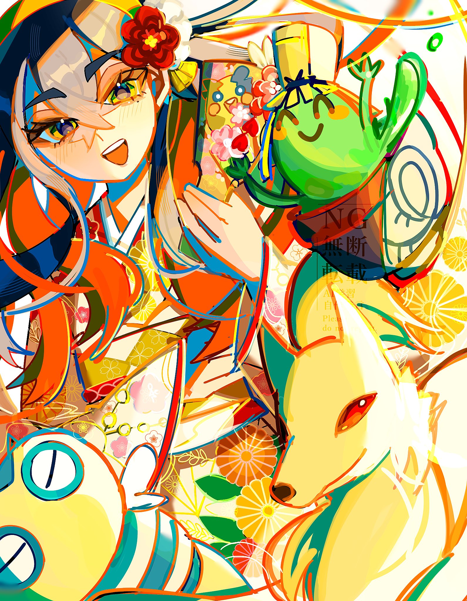1girl :d alternate_costume black_hair blush carmine_(pokemon) crossed_bangs dunsparce eyelashes floral_print floral_print_kimono flower gen_1_pokemon gen_2_pokemon gen_8_pokemon hair_between_eyes hair_flower hair_ornament hairband highres japanese_clothes kimono morpeko morpeko_(full) multicolored_hair nfvw2evamr86075 ninetales nintendo open_mouth pokemon pokemon_(creature) pokemon_scarlet_and_violet print_kimono red_hair sinistcha smile teeth two-tone_hair upper_teeth_only yellow_eyes yellow_hairband