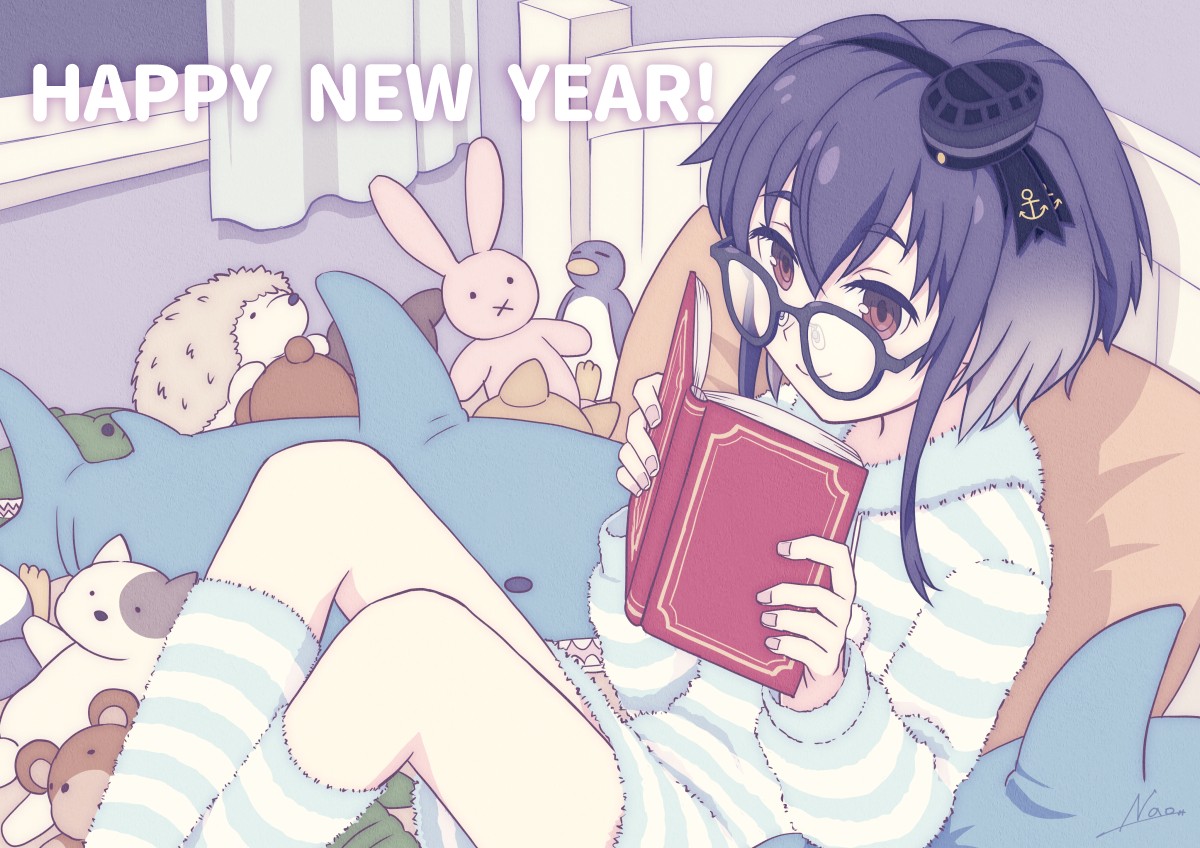 1girl alternate_costume anchor_symbol bed bespectacled black_hair book brown_eyes dress fur_dress glasses gradient_hair happy_new_year hat hat_ribbon hooded_dress kantai_collection mini_hat multicolored_hair nao_(nao_eg) new_year pillow porcupine ribbon short_hair short_hair_with_long_locks sleepwear smokestack_hair_ornament socks solo striped_clothes striped_dress striped_socks stuffed_animal stuffed_dog stuffed_penguin stuffed_porcupine stuffed_rabbit stuffed_shark stuffed_toy tokitsukaze_(kancolle)