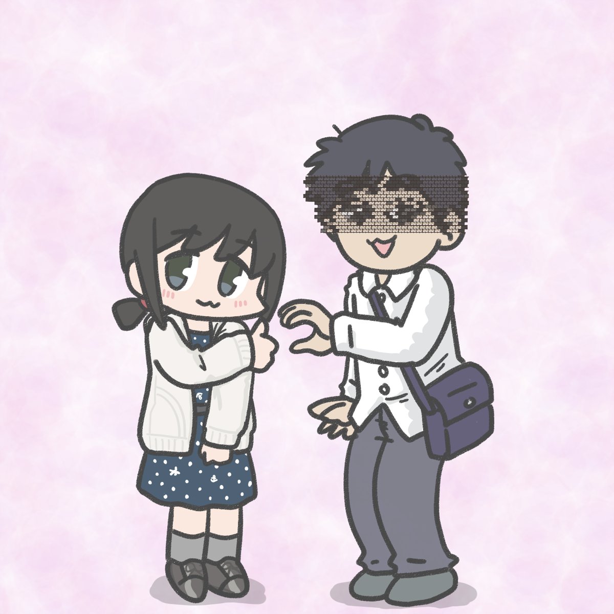 1boy 1girl admiral_(kancolle) black_eyes black_hair blue_dress censored censored_identity dress ferret-san fubuki_(kancolle) fubuki_(spring)_(kancolle) full_body heart_hands_failure highres jacket kantai_collection low_ponytail medium_hair official_alternate_costume pink_background polka_dot polka_dot_dress ponytail short_ponytail standing thumbs_up white_jacket