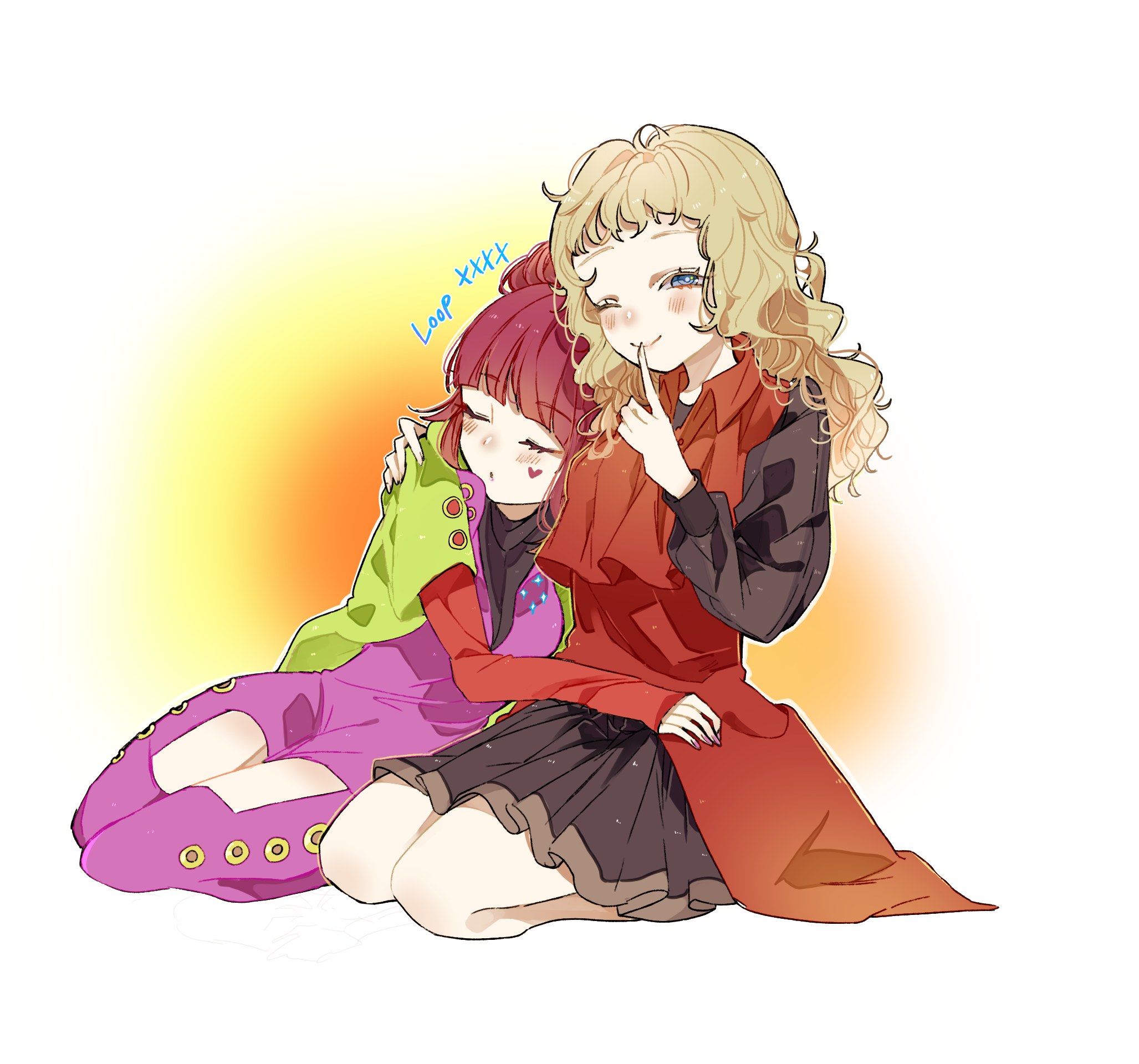 2girls blunt_bangs earrings eyelashes gnosia hair_between_eyes hairband heart heart_earrings heart_tattoo high_ponytail highres hitsujiya.m jewelry kukrushka_(gnosia) long_hair long_sleeves multiple_girls nail_polish ponytail red_hair sleeping sq_(gnosia) straight_hair tattoo turtleneck