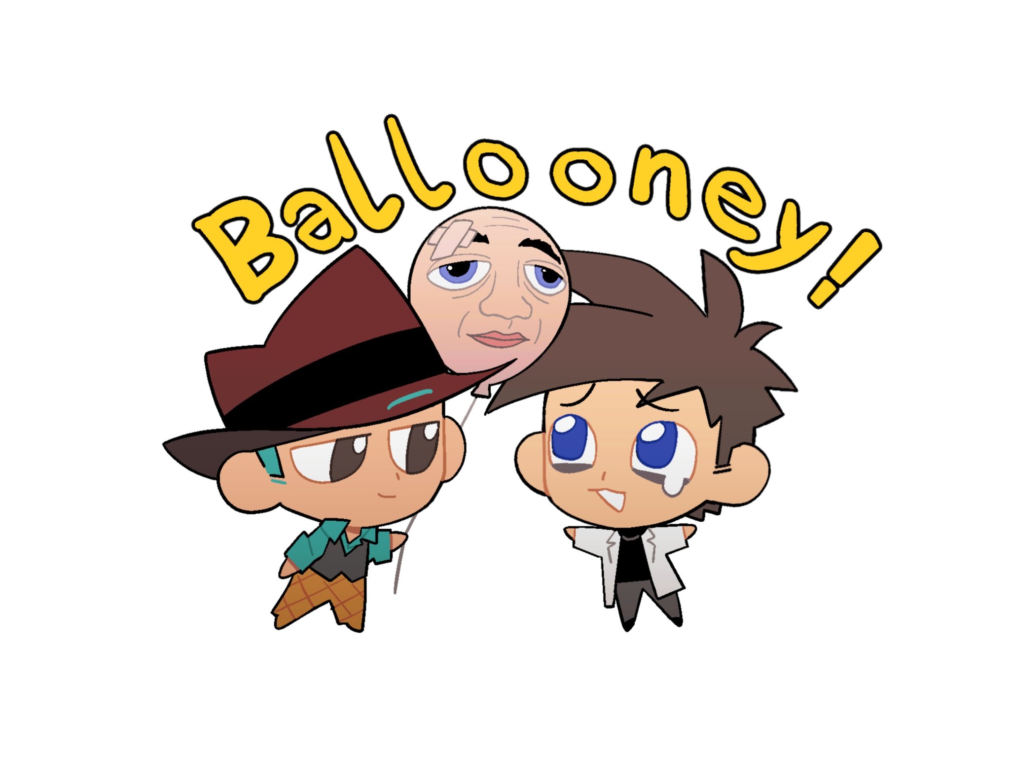 2boys aqua_hair balloon brown_eyes brown_hair chi_zhenjiao fedora full_body hat heinz_doofenshmirtz highres humanization multiple_boys pants perry_the_platypus personification phineas_and_ferb short_hair short_sleeves simple_background white_background