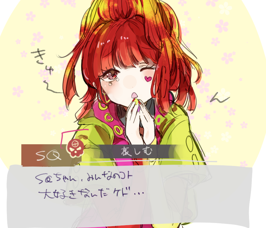 1girl black_hair blunt_bangs earrings eyelashes gloves gnosia hair_between_eyes hairband heart heart_earrings heart_tattoo high_ponytail hitsujiya.m jewelry long_hair long_sleeves looking_at_viewer nail_polish one_eye_closed ponytail red_eyes red_hair simple_background solo sq_(gnosia) straight_hair tattoo translation_request turtleneck upper_body