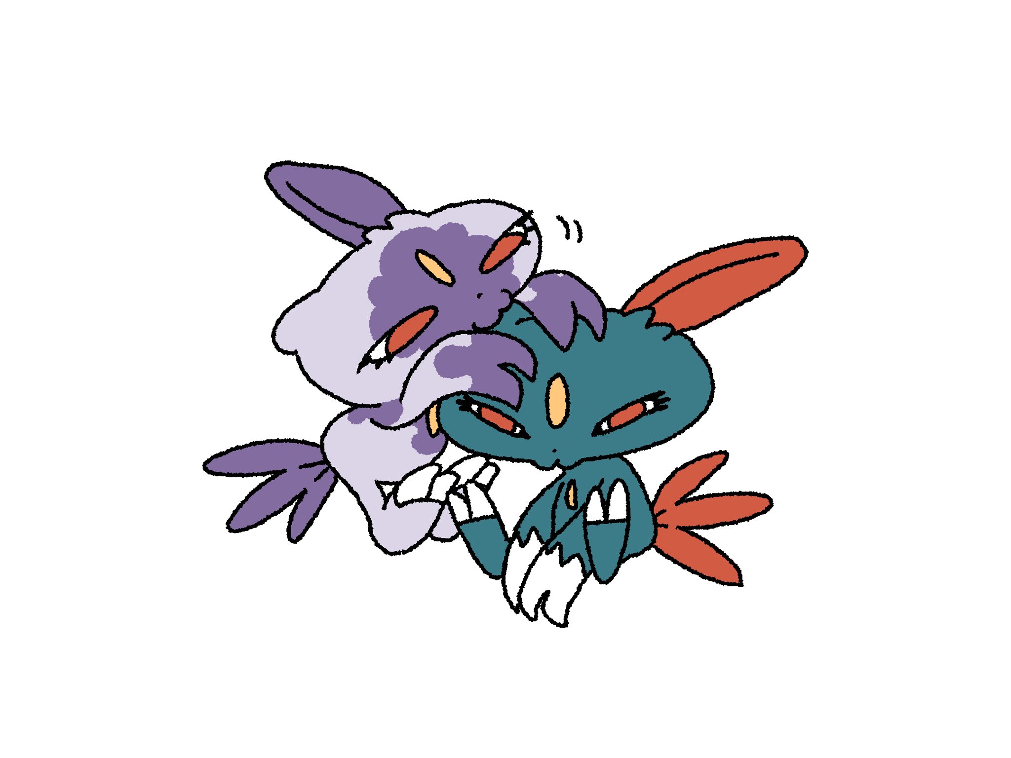 00tamakichi :3 claws colored_skin dot_nose ear_in_mouth eyelashes forehead_jewel gem gen_2_pokemon green_skin hands_on_another's_head highres hisuian_sneasel looking_ahead looking_at_another narrowed_eyes nintendo pokemon purple_skin red_eyes simple_background sitting sneasel standing white_background yellow_gem